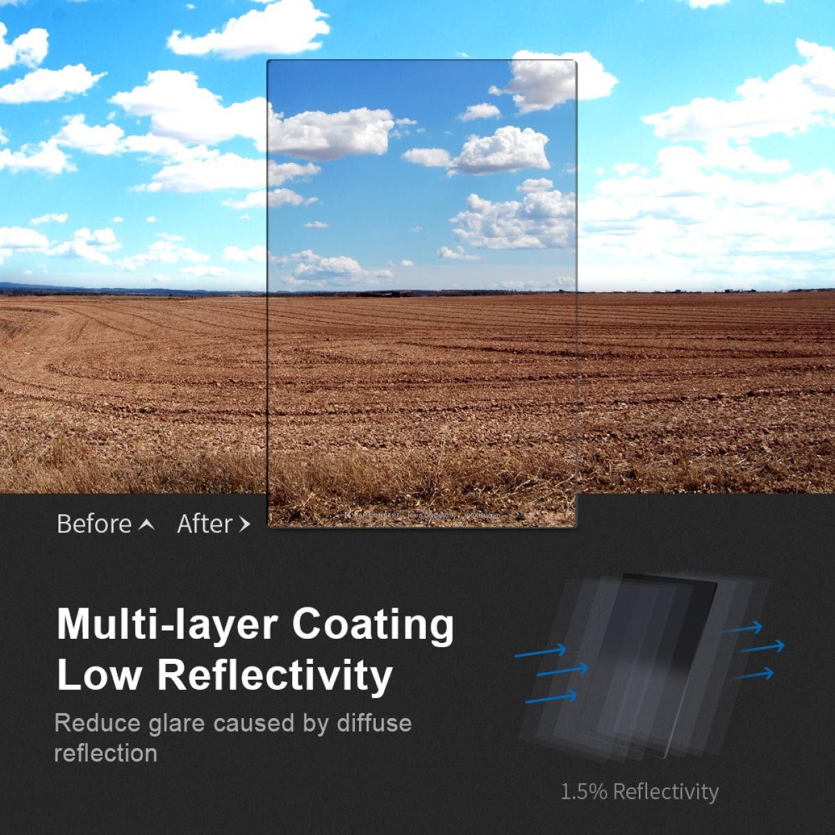 Čtvercový filtr K&F Concept 100×150×2 mm s tvrdým přechodem GND8 je ideální pro fotografy, kteří zachycují scény s výraznými rozdíly v osvětlení, jako jsou horizonty po východu nebo západu slunce, hladina moře, mraky nebo vrcholky hor. Tento filtr s tvrdým přechodem GND8 je vyroben z prvotřídního japonského optického skla, které zajišťuje výjimečnou čistotu a přesnost barev. Přesné oboustranné leštění v kombinaci s technologií nano povlaku zajišťuje vysoké rozlišení obrazu a zároveň poskytuje ochranný povrch odolný proti vodě, prachu a oleji, který umožňuje snadné čištění bez poškrábání skla. S nejnižším odrazem v oboru, pouhými 2 %, minimalizuje nežádoucí odlesky a zachovává přirozené, živé barvy. Díky rozměrům 100 × 150 mm a tloušťce 2 mm je kompatibilní se standardními čtvercovými držáky filtrů, což nabízí flexibilitu pro použití s více objektivy.