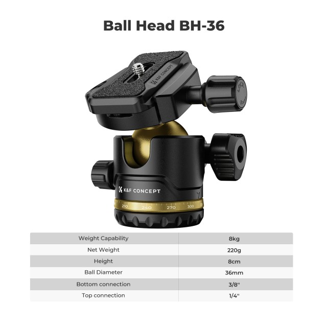 Pokročilá konstrukce kulové hlavy: Velká 36mm kulová hlava zajišťuje stabilitu a má novou bezolejovou konstrukci tlumení pro plynulé a přesné pohyby fotoaparátu. Vodorovná stupnice 360 stupňů na základně hlavy usnadňuje panoramatické fotografování a poskytuje úžasnější výsledky než ultraširokoúhlý objektiv. Kulová hlava unese až 8 kg.