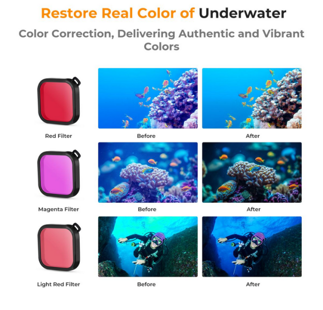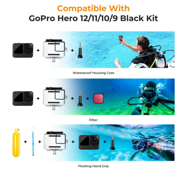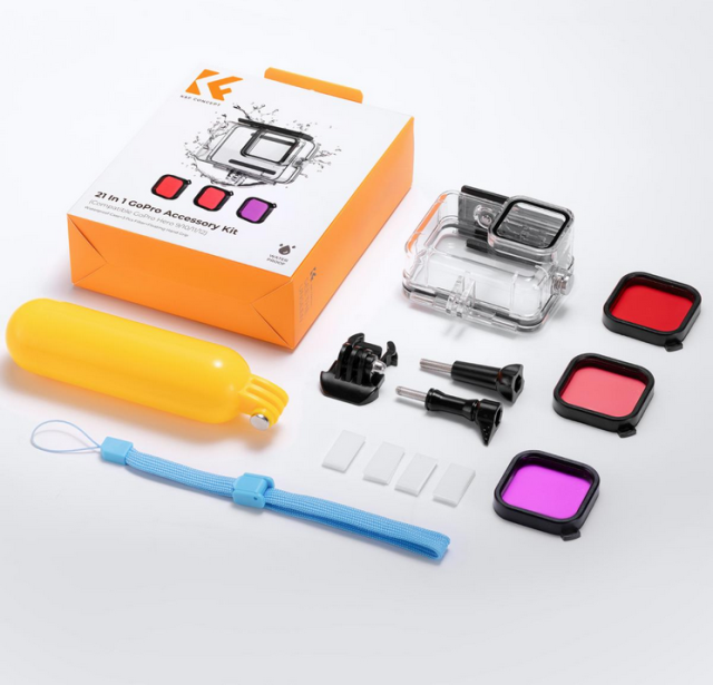 Vodotěsná sada K&F 21 v 1 je speciálně navržena pro kamery GoPro Hero 12, 11, 10 a 9 Black a poskytuje komplexní ochranu a všestranné příslušenství pro podvodní dobrodružství. Tato sada obsahuje vodotěsné pouzdro, které podporuje hloubku až 147 stop, sadu potápěčských filtrů pro korekci barev a plovoucí rukojeť pro lepší ovládání a prevenci ztráty. Zajistí, že vaše akční kamera zůstane bezpečná a funkční během plavání, surfování, potápění, šnorchlování a dalších vodních aktivit.