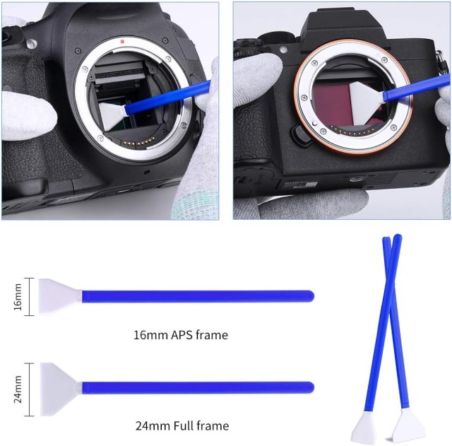 Tampony na čištění snímače pro 24 APS a 16 APS-C : Přizpůsobené podle velikosti snímače snímku, flexibilní úchop umožňuje, aby se jazýček přizpůsobil snímači, aniž by ho poškodil, účinně zabraňuje vzniku nečistot.