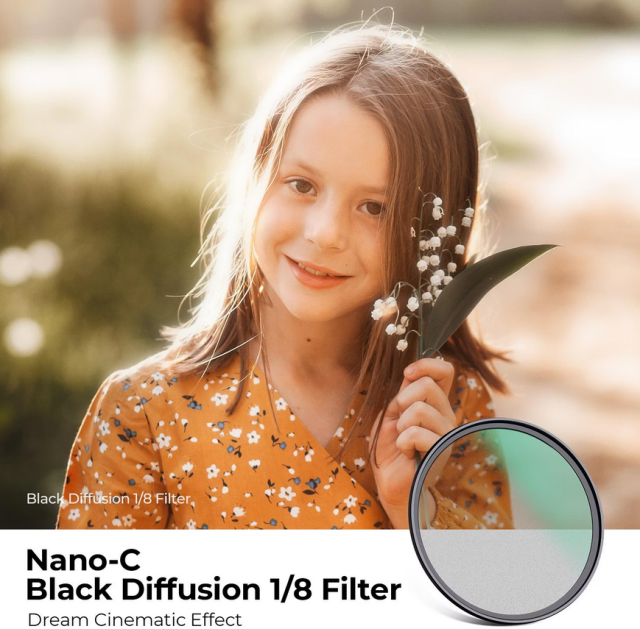 K&F Concept 46 mm C Series Black Mist 1/8 filtr: Ultratenké 3,3 mm vícevrstvé japonské sklo AGC s zeleným povlakem pro jemné filmové rozptýlení a snové zvýraznění.