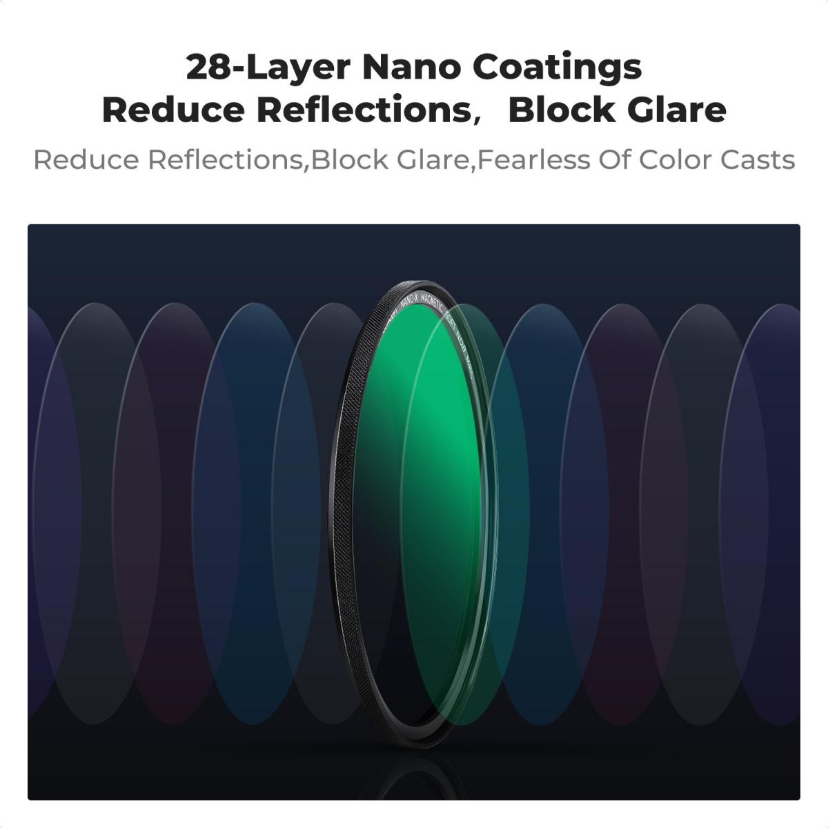 Všechny filtry jsou vybaveny importovaným optickým sklem AGC s vysokým rozlišením a 28vrstvým nano/multi-povlakem, které nabízí odolnost proti poškrábání, voděodolnost, odolnost proti oleji a přesnou reprodukci barev. Ultratenký CNC frézovaný rámeček (1,9–3,33 mm) zabraňuje vinětaci na širokoúhlých objektivech a zároveň zajišťuje hladkou instalaci a demontáž. Součástí balení je kompaktní pouzdro na filtry pro bezpečné skladování a přenosnost.