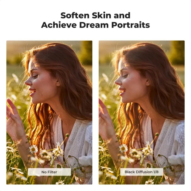 Černý difuzní filtr K&F Concept 1/8 zjemňuje světlo na fotografiích a videích a omezuje odlesky, díky čemuž pleť a póry vypadají jemnější. Technologie oboustranného leštění zajišťuje vysoké rozlišení v ohniskové vzdálenosti do 550 mm. Černý difuzní filtr 1/8 Vyrobeno z japonského vysoce přesného optického skla AGC, vícevrstvá povrchová úprava pro extra průhlednost s propustností 87 %, účinně redukuje odrazy od samotného filtru.