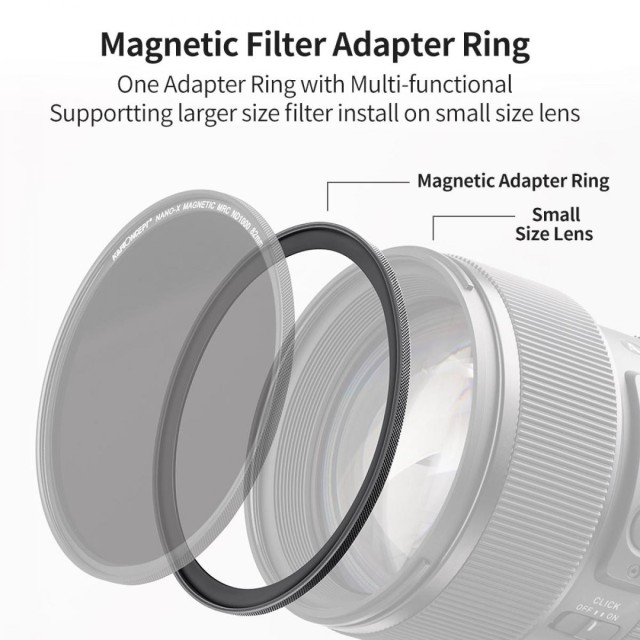 Kompatibilita: Speciálně navrženo pro magnetické filtry objektivů K&F Concept. Upozorňujeme, že tento adaptační kroužek je kompatibilní pouze se 77mm magnetickými filtry a není vhodný pro nemagnetické filtry objektivu.