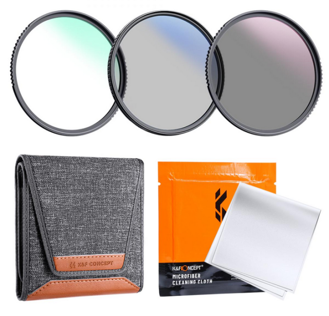 Sada profesionálních filtrů pro objektivy K&F 58 mm 3ks je všestranná a nezbytná sada příslušenství pro fotografy, kteří chtějí zlepšit své fotografické zážitky. Tato sada obsahuje tři klíčové filtry: UV filtr pro ochranu objektivu a redukci UV záření, filtr CPL (cirkulární polarizátor) pro minimalizaci odrazů a zvýšení sytosti barev a filtr ND4 (neutrální hustota) pro snížení světelné expozice a dosažení efektu rozmazání pohybu.