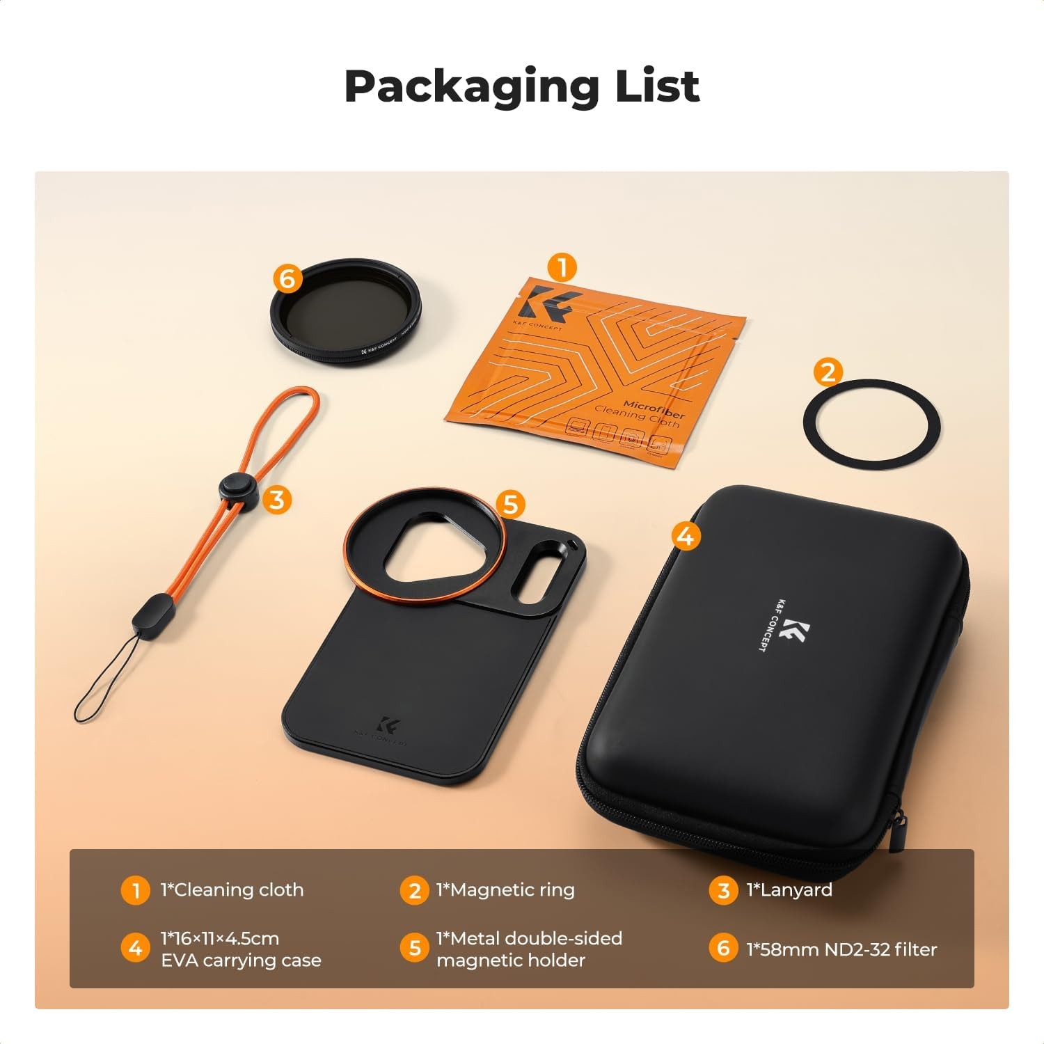 Šroubovací oboustranný magnetický držák filtru K&F 58 mm pro iPhone 17 Pro Max nabízí přesné uchycení, silné oboustranné magnety a podporuje filtry o průměru 58 mm, včetně přiloženého filtru VND. Zajišťuje stabilní, bezpečné a všestranné mobilní fotografování s komplexní ochranou a přenosným úložištěm.