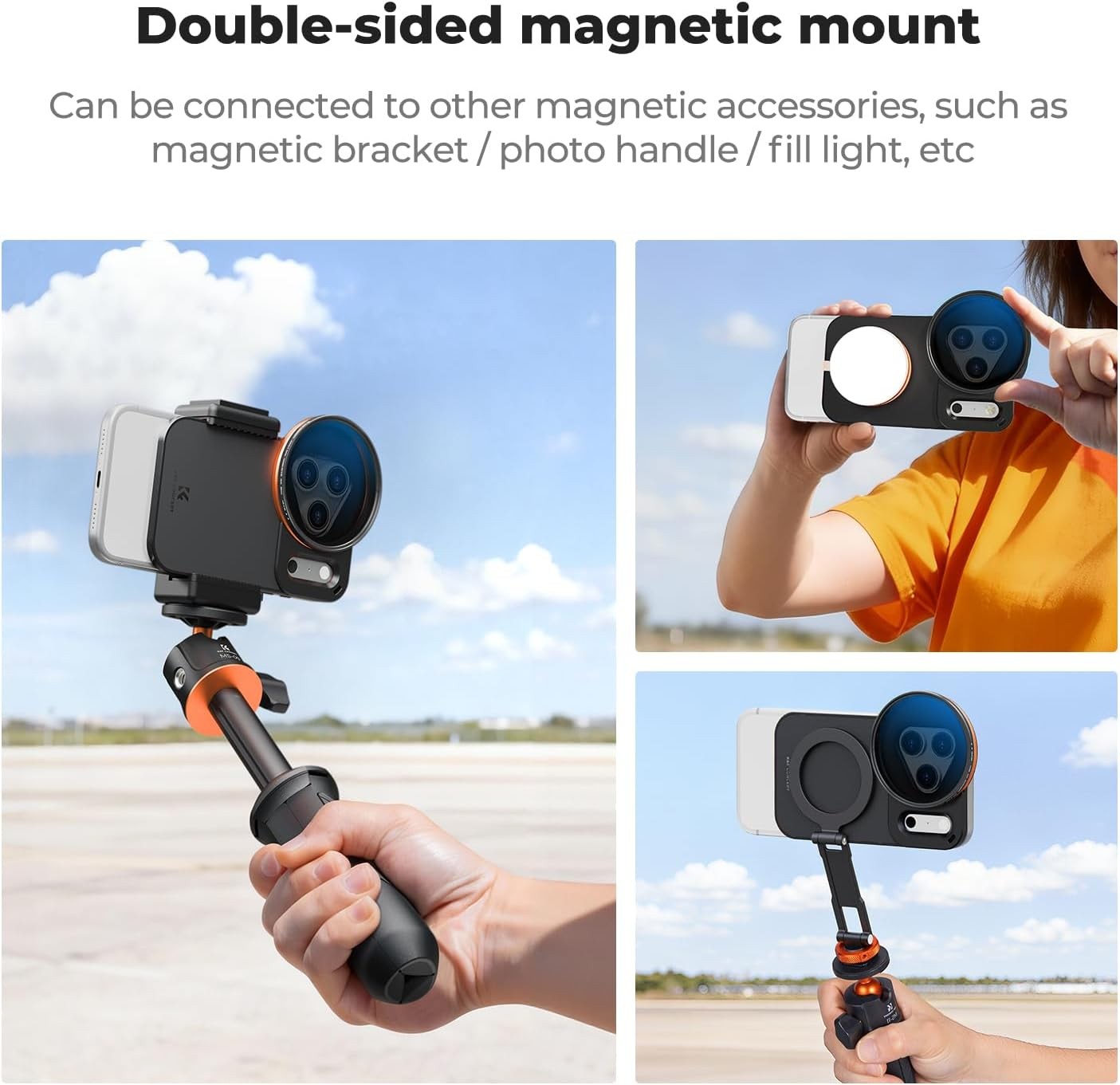Oboustranný magnetický držák je vybaven 17 silnými neodymovými magnety třídy N52 na přední straně a 8 na zadní straně, které poskytují magnetickou sílu 2500 g (≈8 N) pro rychlé a stabilní připevnění. Podporuje také magnetické příslušenství, jako jsou doplňková světla a stativy, pro všestranné použití.