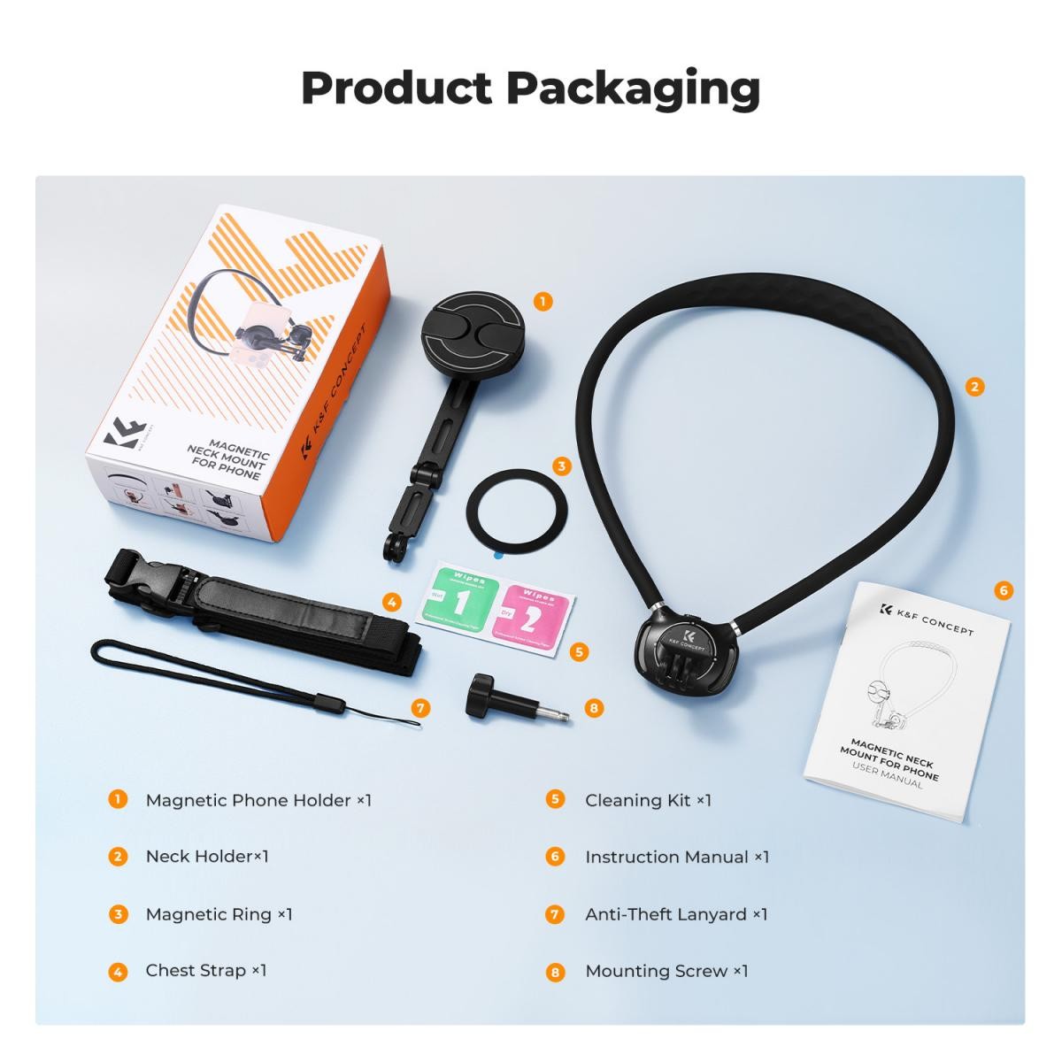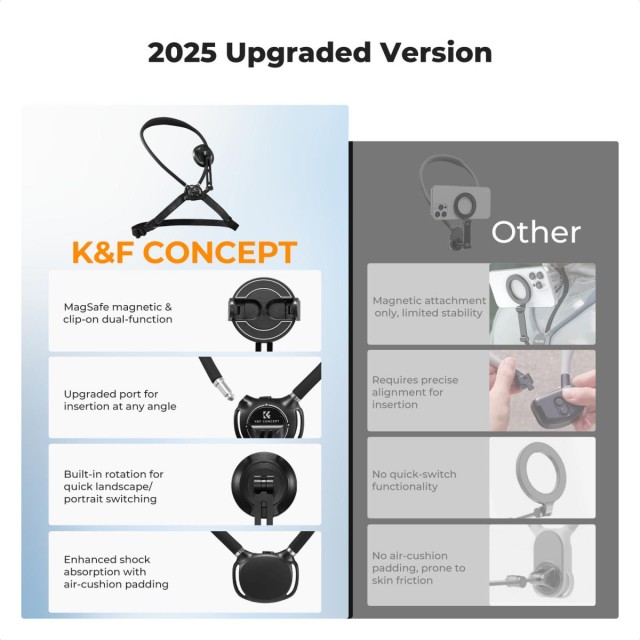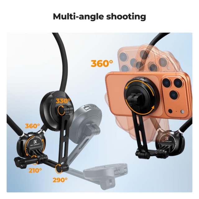K&F CONCEPT magnetický držák na telefon na krk 2v1 s klipem je ideální pro POV záběry. Kompatibilní s iPhone 17–12 a většinou Android telefonů.
