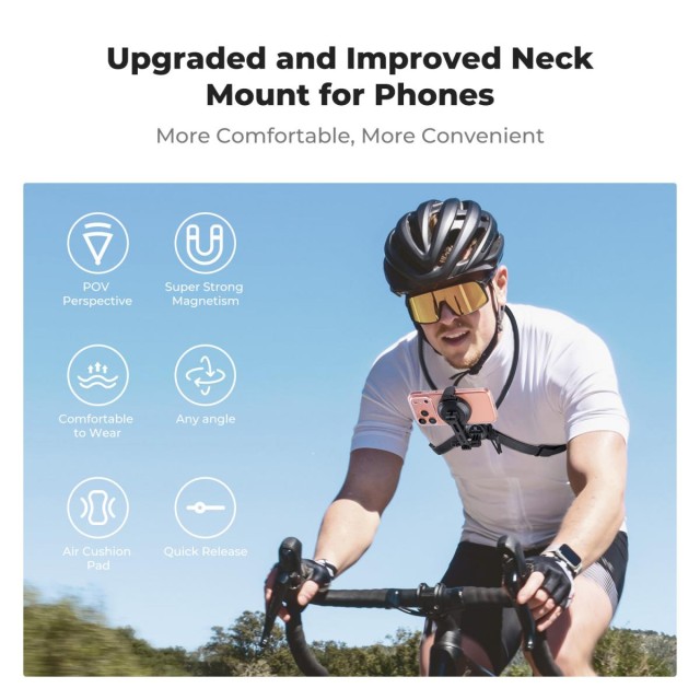 Držák je vybaven jemnou vzduchovou podložkou kolem krku a vylepšeným 1,5 m hrudním pásem, který výrazně snižuje chvění telefonu i kamery, i při intenzivních aktivitách, jako je běh nebo skákání. Tento držák na krk sedí pohodlně lidem až do výšky 190 cm, což zajišťuje pohodlné používání i po delší dobu.