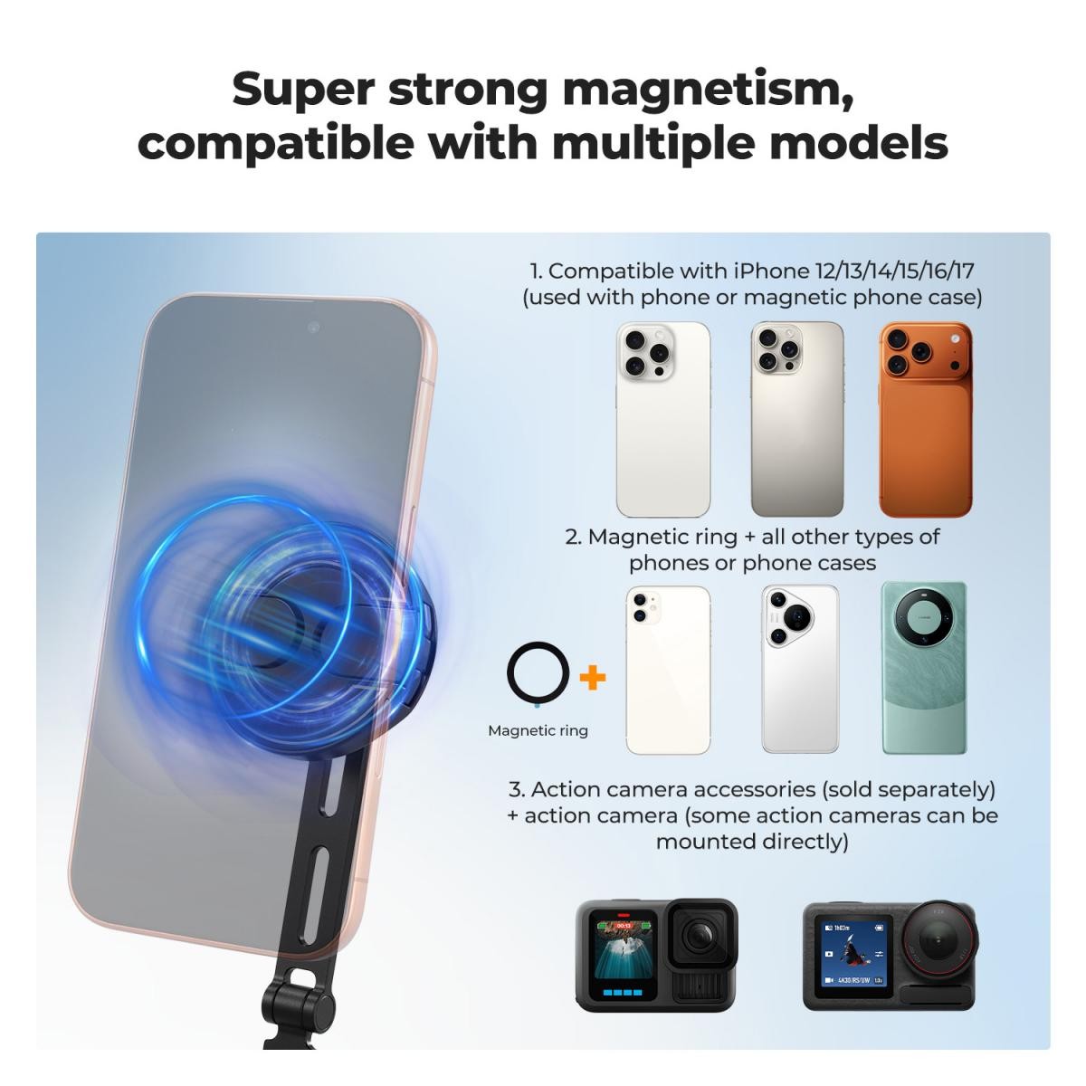 POV držák je kompatibilní s širokou škálou zařízení, včetně 99 % smartphonů. Připevní se přímo k iPhone 17, 16, 15, 14, 13, 12 a oficiálně certifikovaným MagSafe krytům. Držák na krk se také zajišťuje pomocí dvojitého kloubu a T-šroubu. Lze jej přímo připojit k některým action kamerám, například GoPro. Pro ostatní action kamery je potřeba samostatný adaptér.