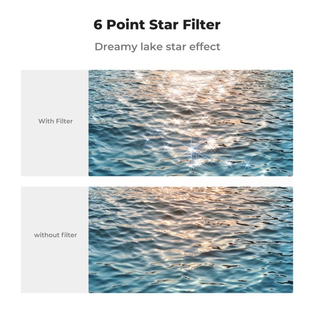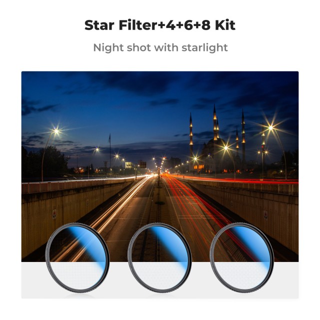 Sada hvězdicových filtrů K&F 82 mm 3ks obsahuje 4, 6 a 8bodové křížové filtry, které jsou navrženy tak, aby vašim fotografiím dodaly jedinečné hvězdicové efekty s vysokou čistotou a minimálními odrazy.