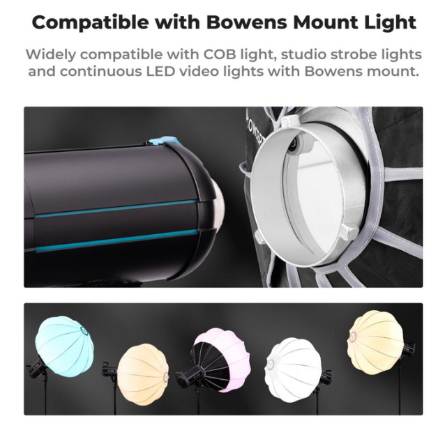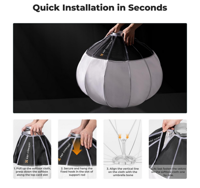 Měkký světelný box K&F 85CM Lantern je určen pro fotografy a filmaře, kteří potřebují všestranné a účinné řešení osvětlení. Jeho sférický design zajišťuje všesměrové měkké světlo v rozsahu 360°, takže je ideální pro použití ve studiu, protože rovnoměrně šíří světlo s úhlem vyzařování 270°. Tento lucernový softbox je ideální pro vytváření měkkého, rovnoměrného osvětlení na velké ploše pomocí jediného světelného zdroje.