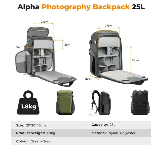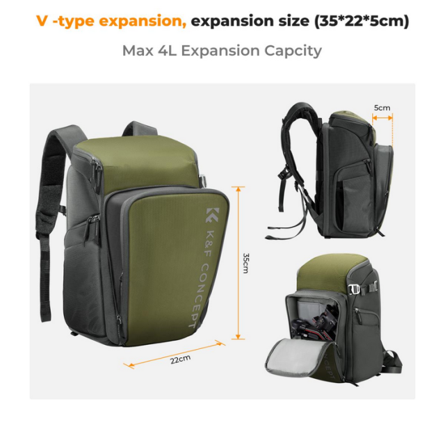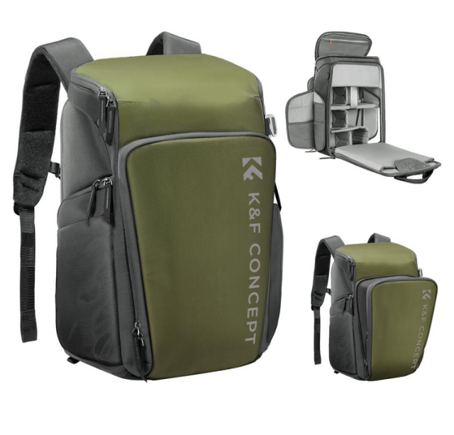 Batoh K&F 25L Nature Wander 01 (zelený) je všestranný fotografický batoh s konstrukcí Magic Bin pro přizpůsobení prostoru, který nabízí přístup shora a z boku, rozšiřitelnou kapacitu a větší stabilitu pro vaše vybavení. Je ideální pro outdoorovou, streetovou a portrétní fotografii, s vyhrazenou přihrádkou pro 16palcový notebook.