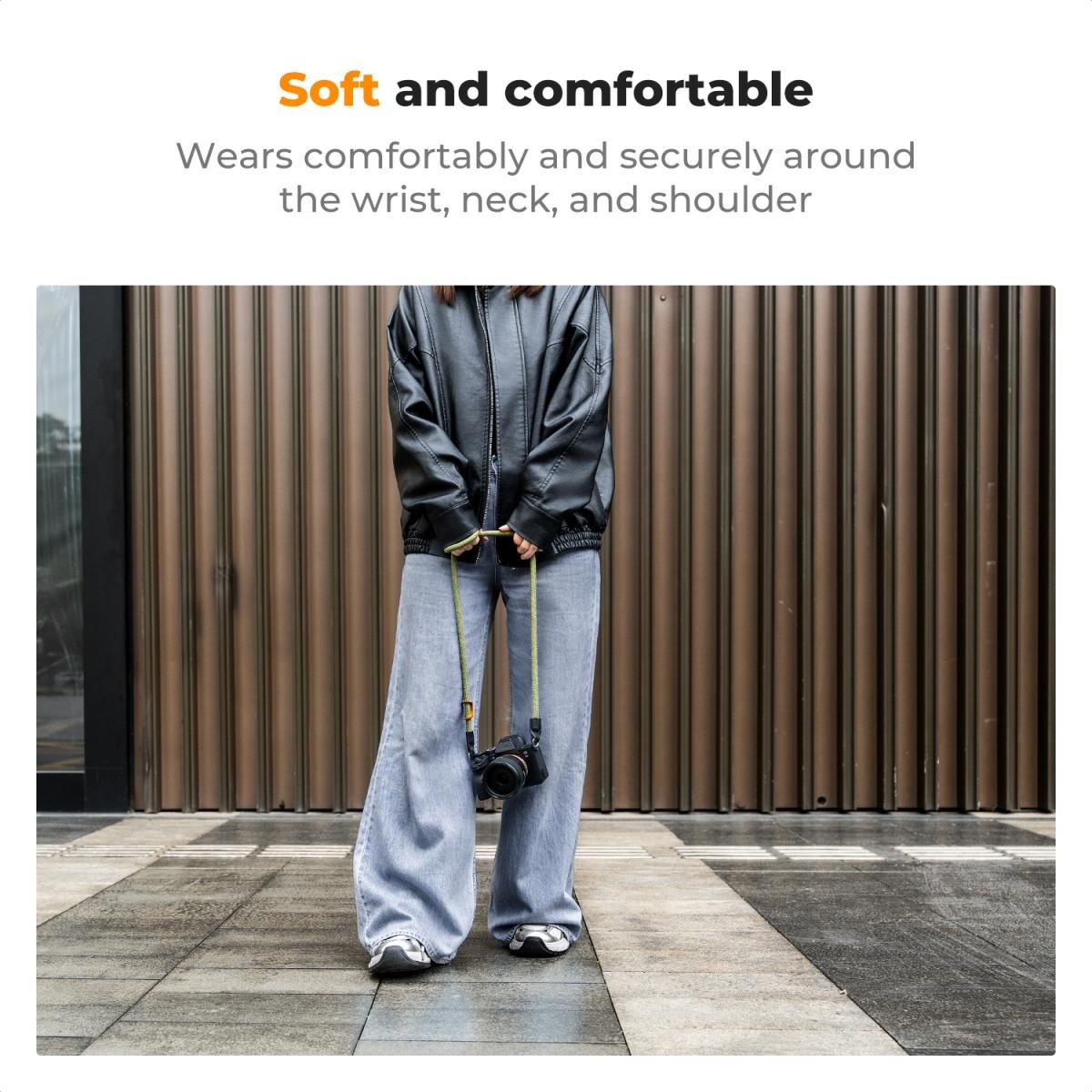 Lehký a měkký popruh poskytuje pohodlné nošení kolem krku i při dlouhodobém používání, ideální pro dlouhé fotografické seance.