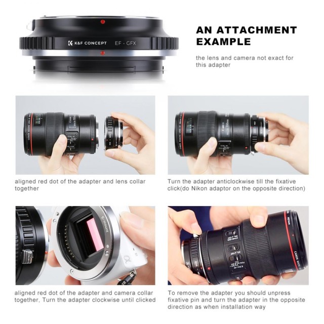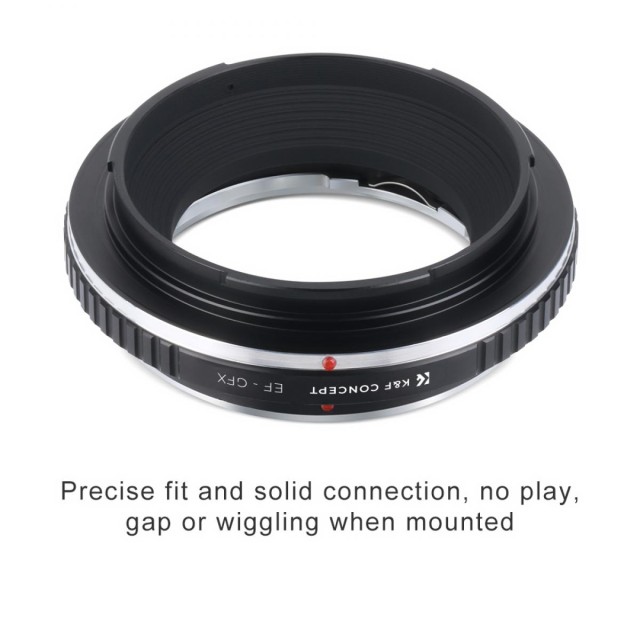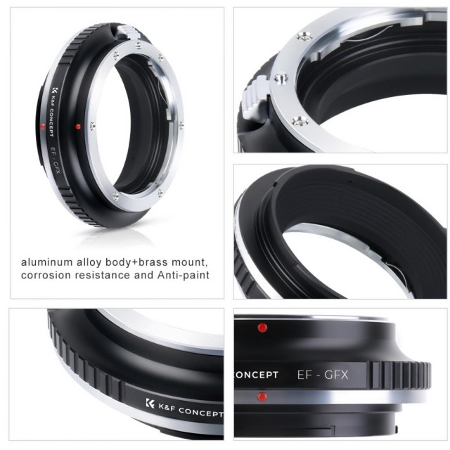 Adaptér objektivu K&F Canon EF na Fuji GFX umožňuje připevnění objektivů Canon EOS s bajonetem EF na středoformátové fotoaparáty Fujifilm GFX. Má odolnou kovovou konstrukci a umožňuje plně manuální ovládání.