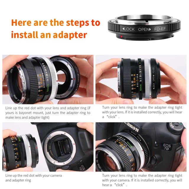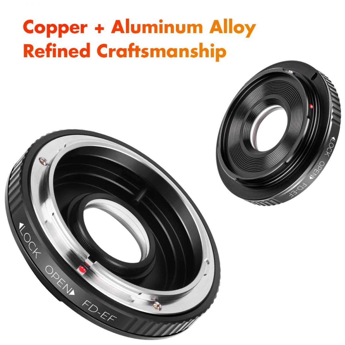 Adaptér K&F Concept Canon FD Lenses to Canon EOS Mount Camera Adapter with Optic Glass je určen pro fotografy, kteří chtějí přenést vintage objektivy Canon FD/FL do moderní digitální éry. Tento precizně vyrobený adaptér umožňuje plně manuální ovládání – včetně manuálního zaostřování, manuální expozice a zaostřování na nekonečno – díky zabudovanému optickému sklu. Je vyroben z vysoce kvalitního tvrzeného eloxovaného hliníku a nabízí vynikající odolnost a bezpečné uchycení mezi objektivem a tělem fotoaparátu. Je kompatibilní s širokou škálou digitálních zrcadlovek Canon EOS EF a EF-S, jako jsou řady 1D/1Ds, 5D, 7D a oblíbené modely Rebel, a otevírá kreativní možnosti spojením starších objektivů s moderní zobrazovací technologií. Kompatibilitu ověřte v uživatelské příručce nebo na webových stránkách výrobce.
