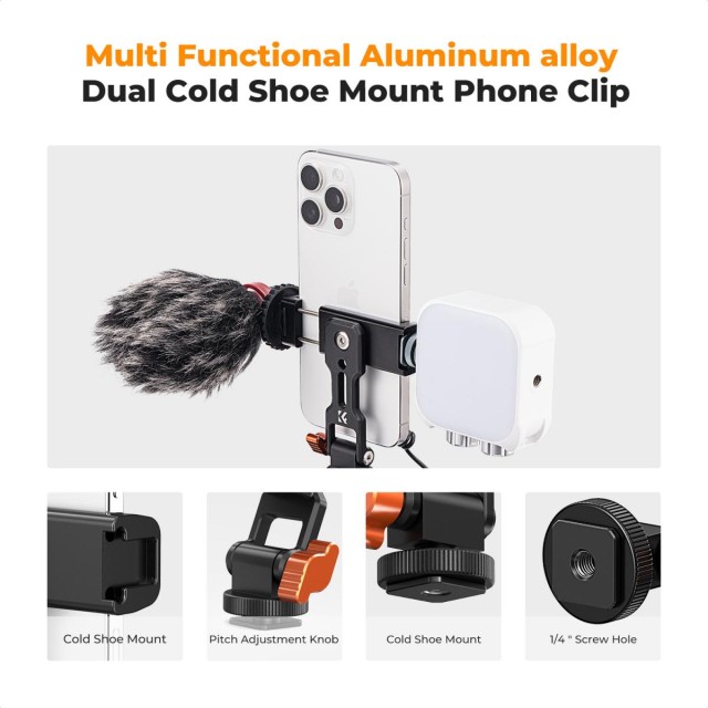 Stativový držák na telefon je vybaven dvěma porty pro připojení mikrofonů, plnicích světel a dalšího příslušenství. Kromě toho lze porty studené patice otáčet a nastavit tak úhel příslušenství. Tento držák na mobilní telefon podporuje natáčení s náklonem až 180° a nastavení úhlu 360° do všech stran, čímž se přizpůsobí různým scénářům natáčení. Úhel náklonu lze nastavit na stativu nebo horké botě fotoaparátu bez kulové hlavy, což usnadňuje jeho používání.