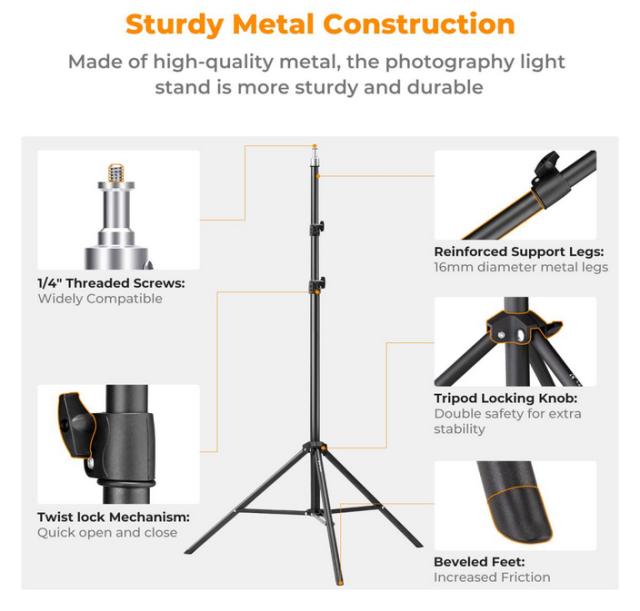 Stojan je vybaven stativovou základnou s prodlužovací tyčí, která zvyšuje stabilitu, zatímco skládací nohy a protiskluzové nožičky zajišťují stabilitu stojanu i na nerovném povrchu. Stojan je výškově nastavitelný v rozmezí od 80 cm do 200 cm (31,5" až 78,8"), takže se může přizpůsobit různým scénářům fotografování a poskytuje flexibilitu ve studiu i v exteriéru.