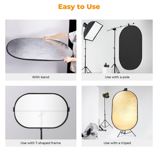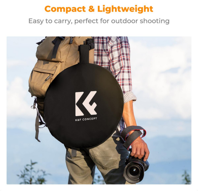 Tento reflektor se rychle složí do kompaktních rozměrů, což usnadňuje jeho skladování a přepravu, zejména pro fotografy, kteří jsou neustále na cestách. Pro větší pohodlí se dodává s brašnou na přenášení. Zlatý a stříbrný povlak reflektoru je vyroben z vysoce kvalitní tkaniny, je odolný proti vyblednutí a hladký zip zajišťuje snadnou manipulaci.