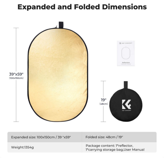 Oválný skládací reflektor 5 v 1 K&F Concept 40" x 60" (100x150 cm) je nezbytným nástrojem pro fotografy, kteří chtějí kontrolovat a vylepšovat osvětlení během fotografování. Tento skládací reflektor má pět různých povrchových úprav - zlatou, stříbrnou, bílou, černou a průsvitnou - a poskytuje univerzální světelné efekty, které vyhovují různým podmínkám fotografování.