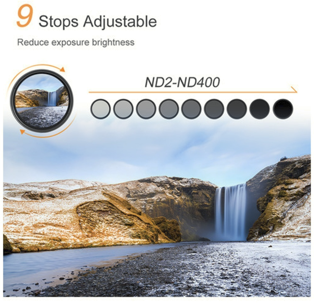 Filtr K&F Concept 49 mm True Color Variable ND2–ND400 vám umožňuje přesné ovládání expozice v rozmezí 1 až 9 stupňů při zachování přirozených a přesných barev. Je vyroben z prvotřídního japonského optického skla a opatřen vícevrstvým nano povlakem, díky čemuž zajišťuje ostré, vysoce kvalitní snímky a plynulé video za jasných světelných podmínek – ideální pro dlouhé expozice, filmové záběry a fotografování s velkou clonou.
