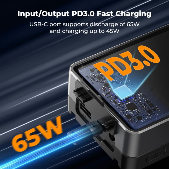 - Obousměrné rychlé nabíjení PD, podporuje více nabíjecích protokolů, například PD3.0/2.0, rozhraní USB-C podporuje až 65W vybíjení, až 45W nabíjení, plně nabije baterii za méně než 2 hodiny a může současně nabíjet mobilní zařízení, například počítače/mobilní telefony;