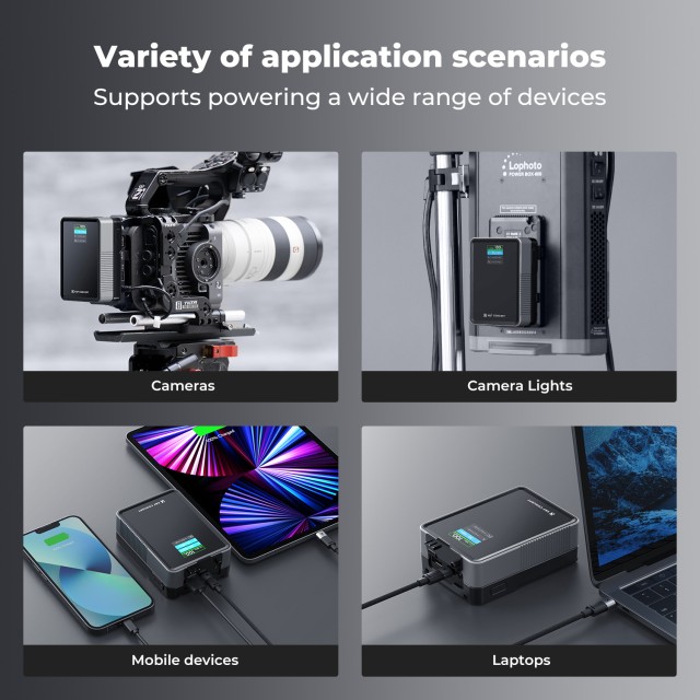 - Standardní kapacita, malé rozměry, ale s kapacitou 50Wh, 3400mAh, například nabíjení iPhone 15/16 Pro Max 2 krát, nabíjení iPad Pro 12,9 palců (2022) 0,8 krát, nabíjení MacBook Pro 14 palců (2021) notebook 0,6 krát, napájení 60W COB video světla po dobu asi 40-50 minut.