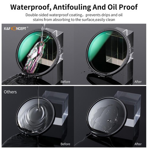 Filtr K&F Concept 55 mm Nano-D Series Variable ND3–ND1000 poskytuje ultrajemné ovládání světla v rozsahu 1,5 až 10 clonových stupňů díky prémiovému japonskému sklu AGC, voděodolnému zelenému nano-povlaku a ultratenkému rámečku o tloušťce 7,4 mm – ideální pro dlouhé expozice, rozmazání pohybu a filmové video.