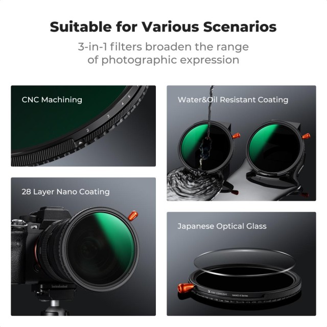 filtr 3 v 1 - 58mm variabilní ND2-32 (1-5 stupňů) a cirkulární polarizační filtr CPL a černá mlha 1/4 3 v 1 HD filtr s 28 vícevrstvými vrstvami pro objektivy fotoaparátů Řada Nano-Xcel. Jeden filtr podporuje redukci světla, vytváří snový efekt a zlepšuje barvy a kontrast obrazu, široce vyhovuje většině fotografických potřeb, poskytuje více kreací pro váš obraz.