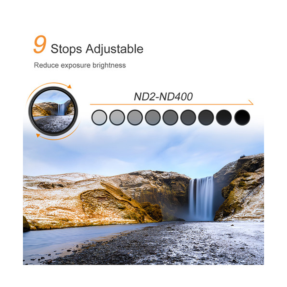 Získejte plnou kontrolu nad expozicí s filtrem K&F Concept 62 mm True Color Variable ND2–ND400. Tento neutrální filtr (ND) určený pro fotografy a filmaře postupně snižuje množství světla vstupujícího do objektivu a umožňuje nastavení až o 8+ clonových stupňů bez změny barev scény. Je ideální pro snímky s dlouhou expozicí, rozmazání pohybu nebo fotografování s široce otevřenou clonou za jasného slunečního světla a pomáhá vytvářet dramatické efekty, jako jsou hedvábné vodopády, rozmazané mraky nebo malá hloubka ostrosti.
