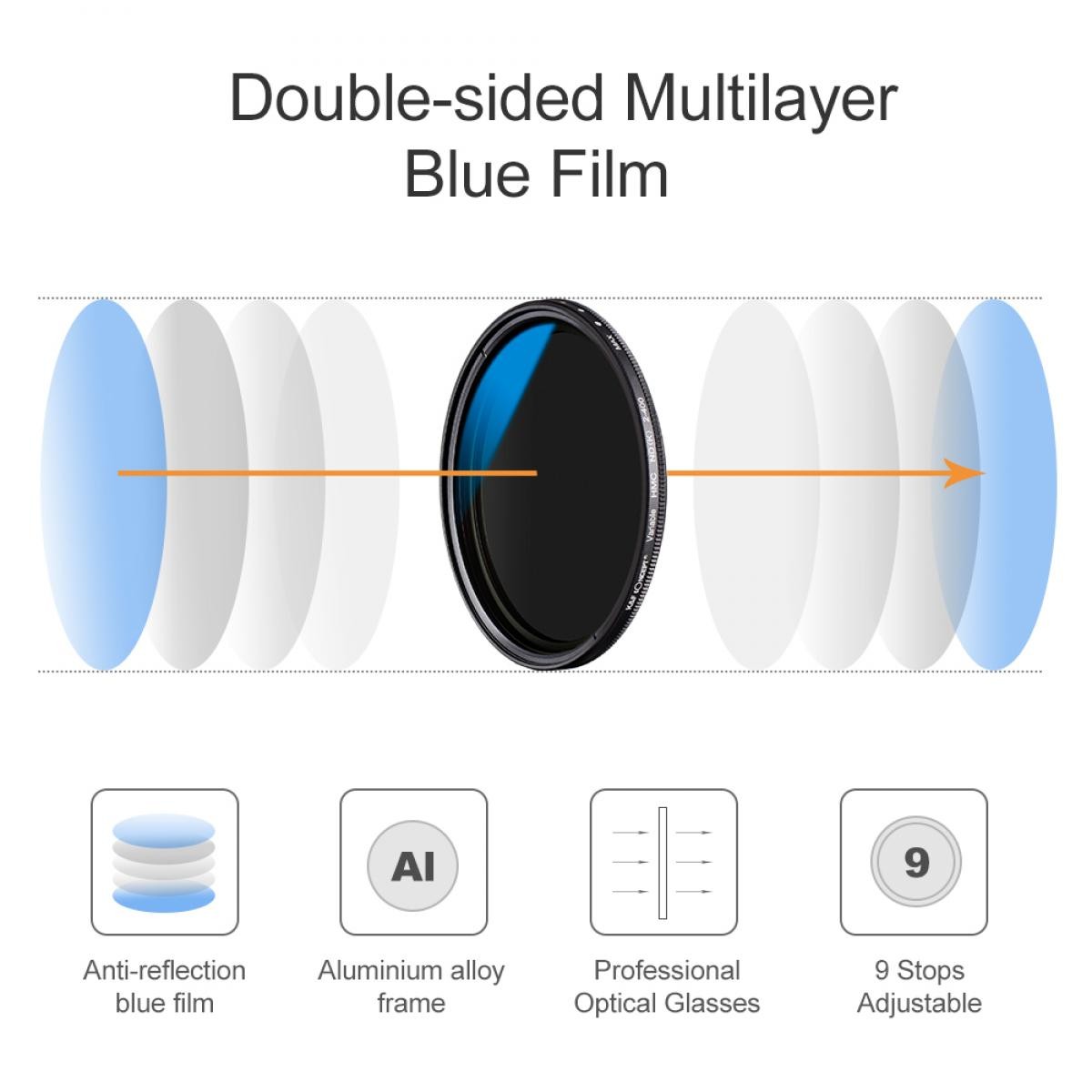 Filtr je vyroben z prvotřídního optického skla, poskytuje vynikající čistotu a minimalizuje optické zkreslení. Otáčením předního prvku lze plynule přecházet mezi úrovněmi ND, což nahrazuje několik pevných filtrů ND a poskytuje bezkonkurenční flexibilitu při fotografování venku. Ultratenký hliníkový rámeček pomáhá zabránit vinětaci i u širokoúhlých objektivů, zatímco jeho odolná konstrukce zajišťuje dlouhodobou spolehlivost. Tento filtr VND je ideální pro fotografování krajiny, portréty s malou hloubkou ostrosti, efekty rozmazání pohybu, videozáznamy za jasného denního světla a kreativní práci s dlouhou expozicí. Je nezbytným nástrojem pro dosažení konzistentní expozice a umělecké kontroly.