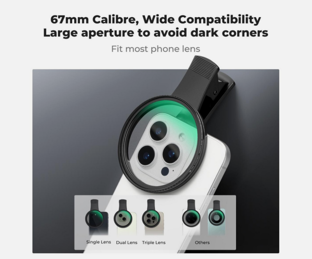 K&F Concept 67mm univerzální držák na mobilní telefon s filtrem Black Mist 1/8: Rychloupínací design pro smartphony, 18vrstvý difuzní filtr s antireflexní vrstvou pro snové haló a změkčené odlesky.