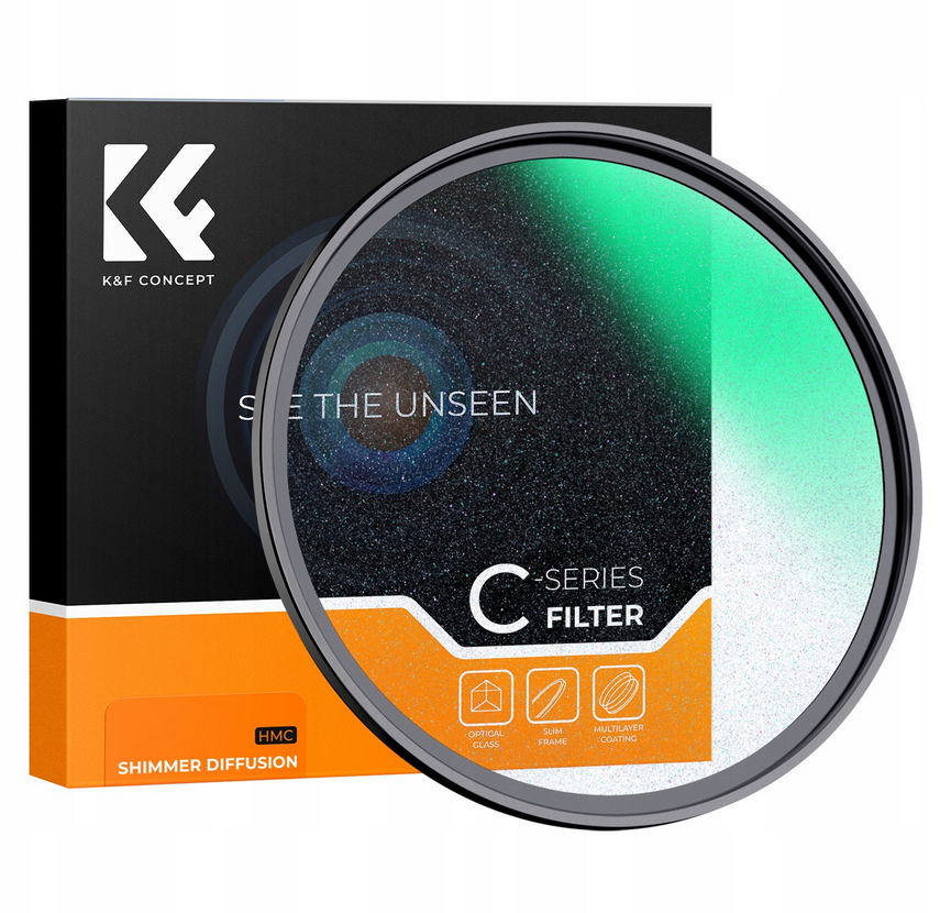 K&F Concept 77mm C Series Microlight Mirror Shimmer Diffusion Filter: HD sklo s nano-povlakem, tenký 3,3mm hliníkový rámeček pro měkké, snové rozptýlení světla a éterické třpytivé efekty.