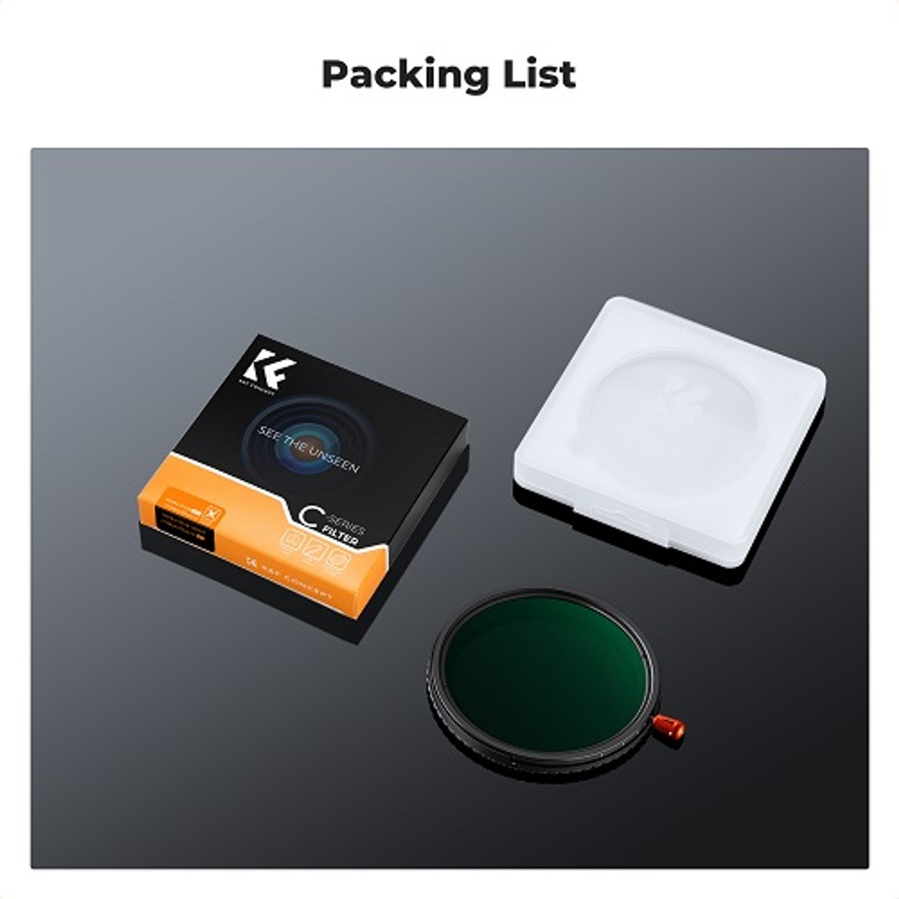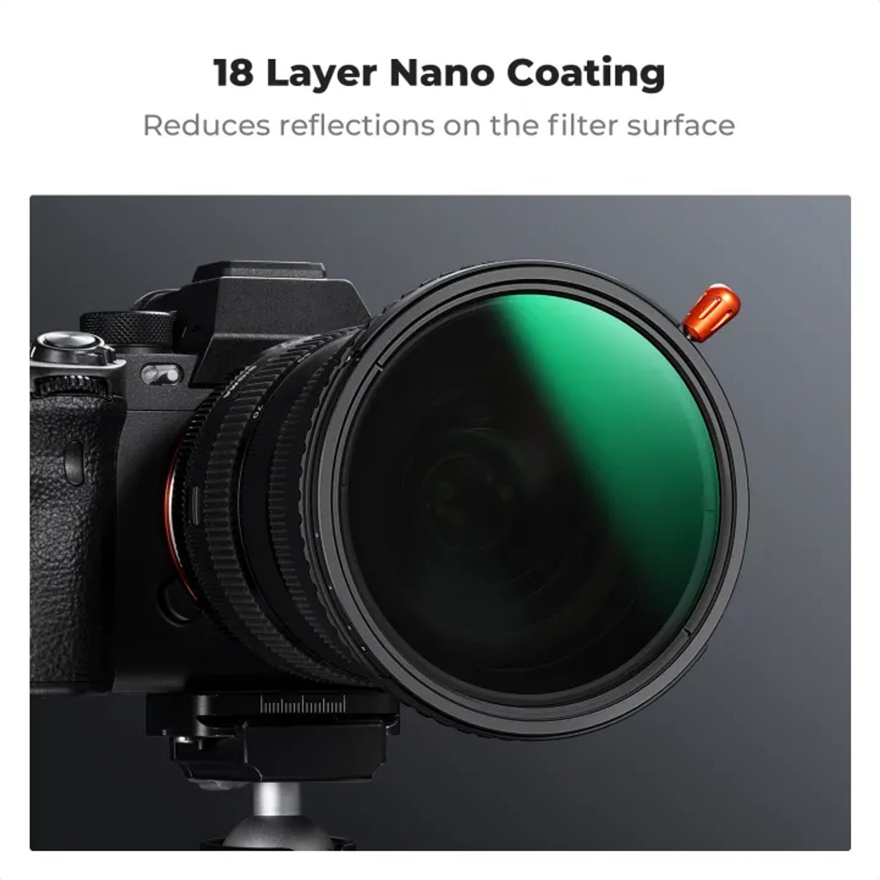 Hybridní filtr K&F Concept 77 mm NANO C Series 3 v 1 kombinuje variabilní ND2–32, kruhový polarizační filtr CPL a difuzní filtr Black Mist 1/4 v jednom univerzálním nástroji. Je ideální pro fotografy a filmaře, protože zajišťuje plynulé snížení intenzity světla, odstranění odlesků, vylepšení barev a kontrastu a filmový efekt měkkého záření – bez černého efektu „X“, který je běžný u mnoha variabilních ND filtrů.