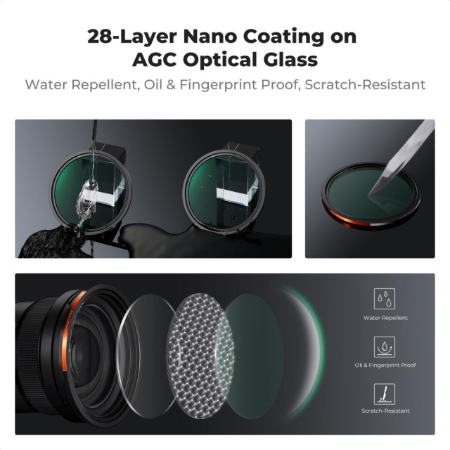Každý filtr je vyroben z japonského skla AGC a chráněn 28vrstvým nano povlakem, díky čemuž poskytuje maximální čistotu a odolnost proti vodě, oleji, poškrábání, otiskům prstů a skvrnám. Technologie věrného podání barev eliminuje nežádoucí barevné odlesky a zajišťuje přesné a realistické výsledky přímo z fotoaparátu. Tato sada, doplněná kompaktním pouzdrem vhodným na cestování, poskytuje vše potřebné pro fotografování krajin, portrétů, filmování a každodenní kreativní fotografování.