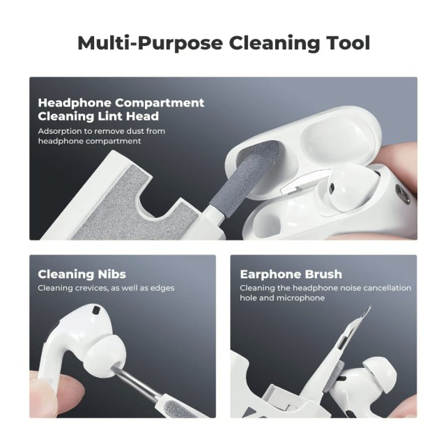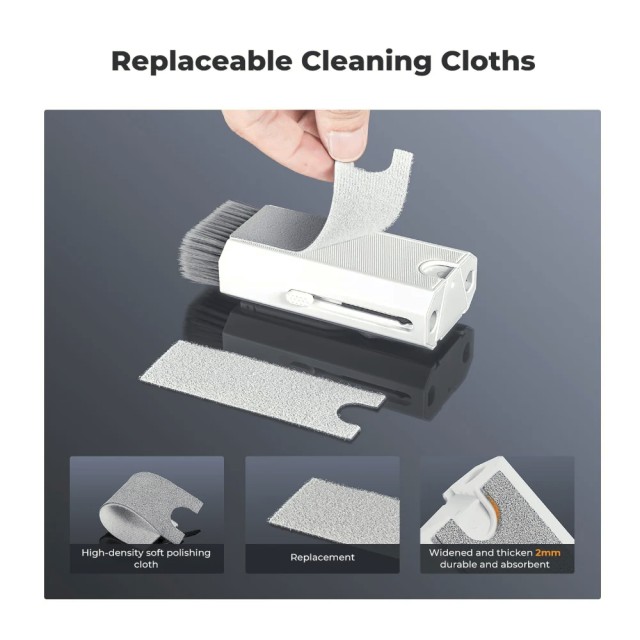 Sada obsahuje měkký zasouvací kartáč z vláken s vysokou hustotou, který dokáže odstranit prach a nečistoty z klávesnic, mobilních zařízení a jiných citlivých povrchů, aniž by je poškrábal nebo zanechal vlákna. Součástí sady jsou také mikrovláknové utěrky pro přesné čištění obrazovek a povrchů, nástroj pro bezpečné vyjmutí kláves z klávesnice a držák na mobilní telefon, který poskytuje pohodlnou oporu při čištění.