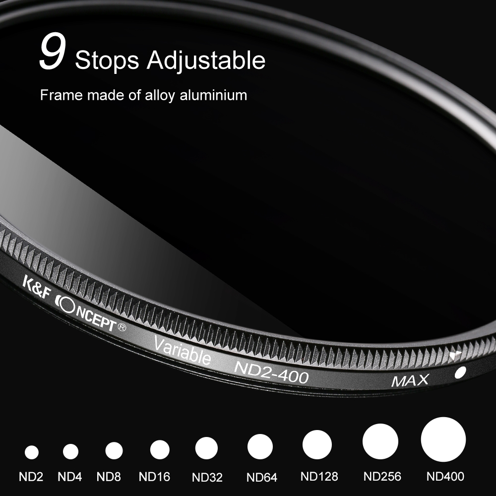 K&F Concept 82MM Slim Variable/Fader NDX, ND2~ND400 znižuje množstvo svetla vstupujúceho do objektívu, čím znižuje rýchlosť uzávierky fotoaparátu. Je to užitočné v situáciách, keď je potrebné vytvoriť pohybovú neostrosť (rieky, vodopády, pohybujúce sa osoby) alebo keď je potrebné použiť veľkú clonu s bleskom, aby sa zabránilo preexponovaniu.