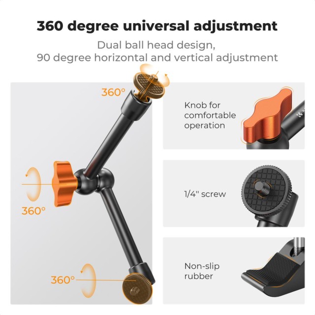 K&F Concept 9.8" Magic Arm se svorkou lze použít s různým fotografickým příslušenstvím. Ať už fotíte z výšky nebo z nízkého úhlu, toto rameno vám umožní objevovat nové úhly záběru.