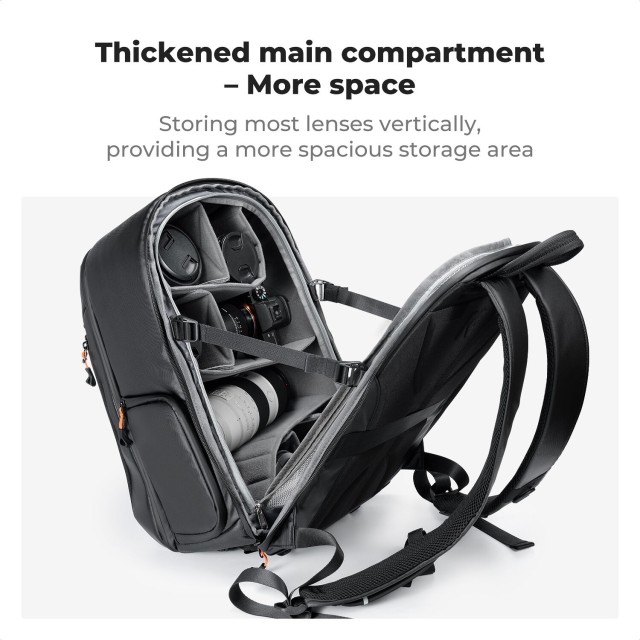 Batoh K&F Concept KF13.211 25 L nabízí chytrou rovnováhu mezi kapacitou a přenosností, což je ideální pro fotografy, kteří jsou často na cestách. Jeho zadní klapkový design umožňuje plný přístup, což je perfektní pro organizaci vybavení, zatímco boční panel umožňuje rychlé vytažení fotoaparátu bez nutnosti sundávat batoh. Přizpůsobitelné pěnové přepážky chrání digitální zrcadlovky nebo bezzrcadlovky, náhradní objektivy a příslušenství, zatímco polstrovaný obal chrání notebook nebo tablet.