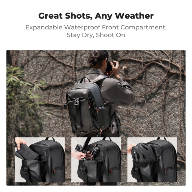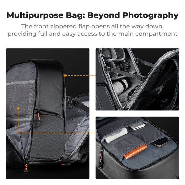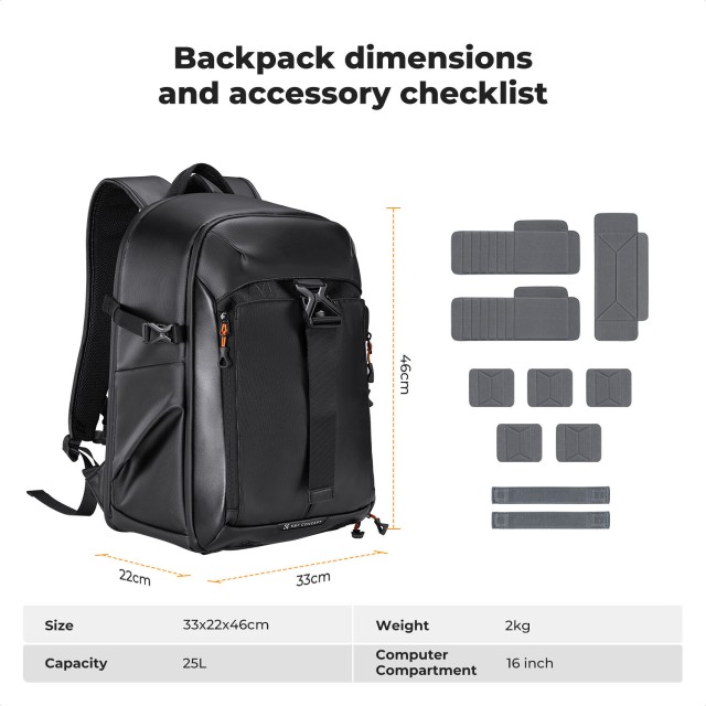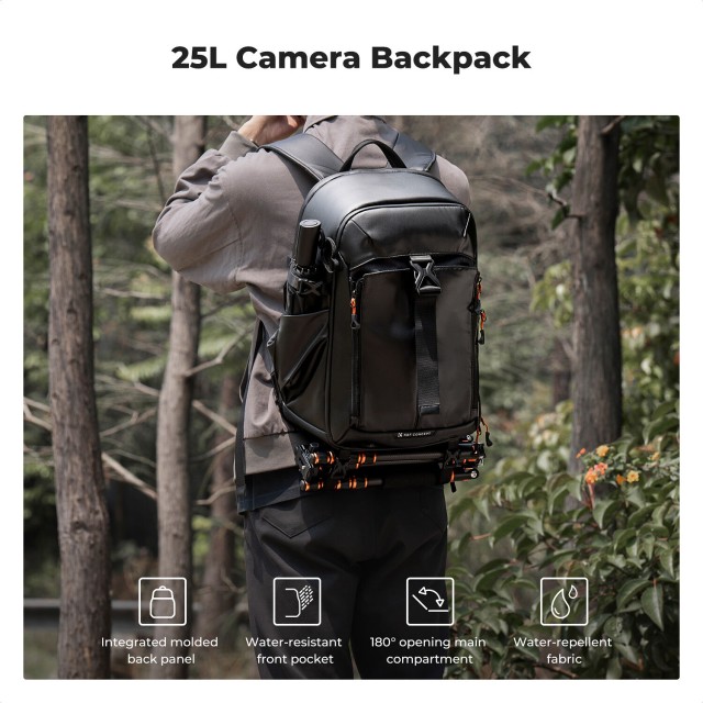Batoh je vyroben z odolného, voděodolného nylonu se zesílenými švy a obsahuje také pláštěnku pro ochranu před mírným deštěm. Vnější popruhy a skryté kapsy umožňují mít nezbytné věci po ruce a pohodlí zajišťuje prodyšné polstrování zad a nastavitelné popruhy. Je ideální pro fotografování ve městě, cestování nebo použití v terénu a jeho spolehlivé vlastnosti odrážejí podobný vysoce kvalitní design jako u jiných variant K&F 25 L. Ačkoli se odolnost může lišit a dlouhodobá podpora je omezená, mnoho uživatelů