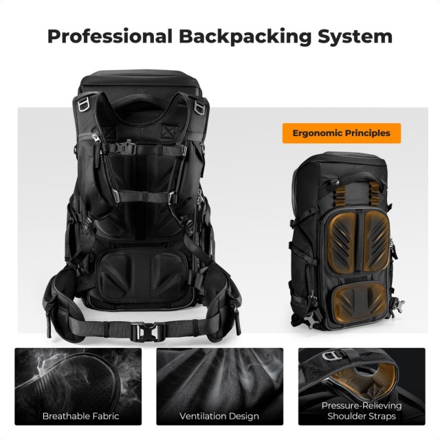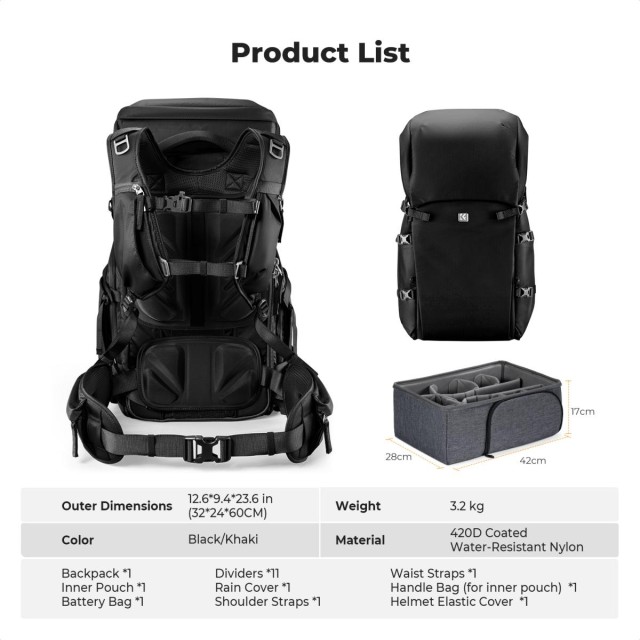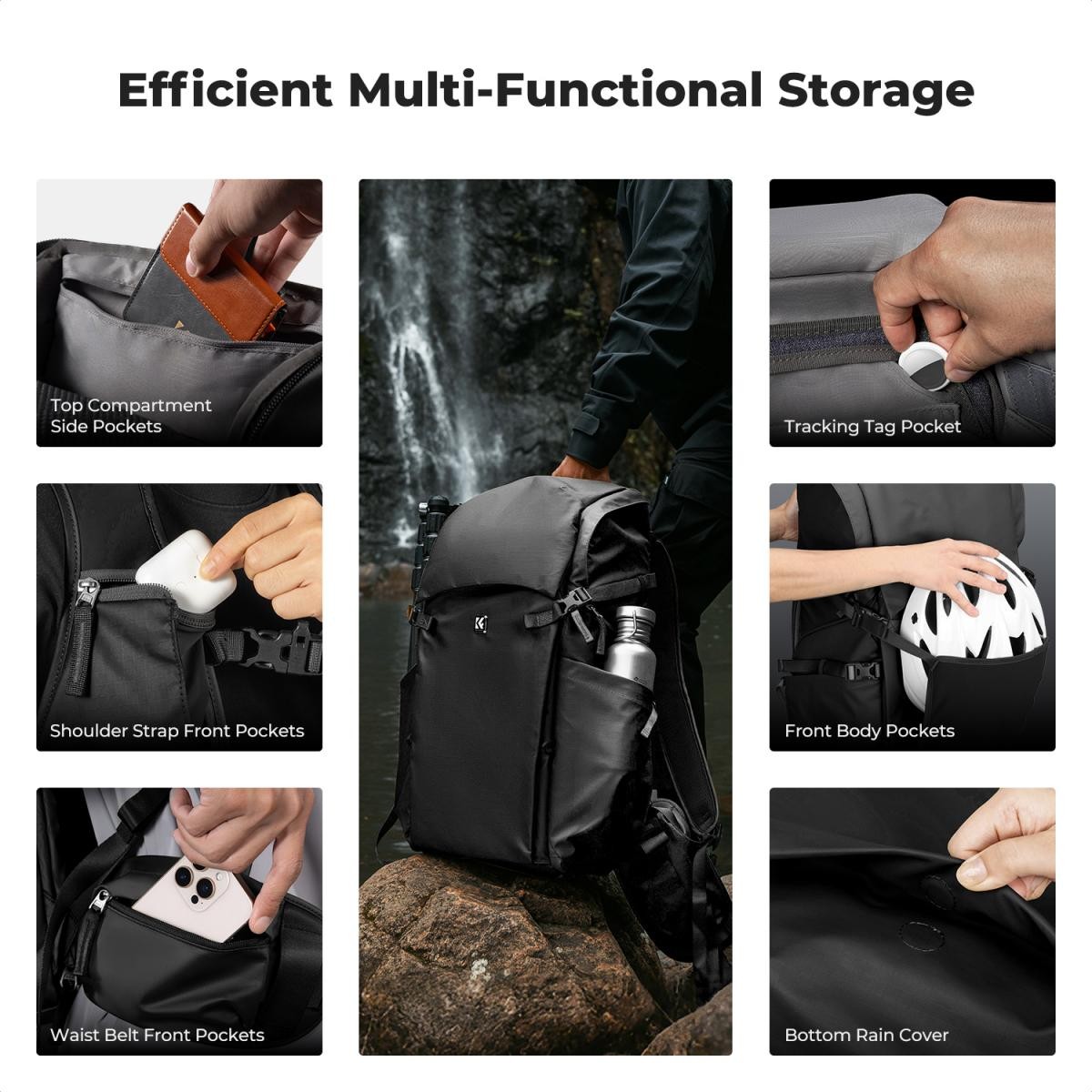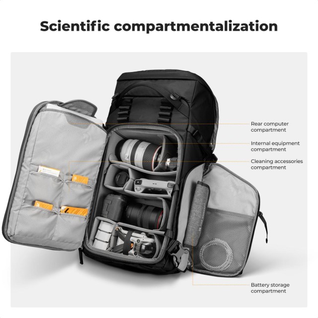 Batoh na fotoaparát K&F CONCEPT Star Wander05 40L (černý) nabízí fotografům a cestovatelům univerzální úložný prostor s velkou kapacitou. Je navržen tak, aby pojmul 2 fotoaparáty, 6 objektivů a příslušenství. Disponuje přizpůsobitelnými přihrádkami, rychlým bočním přístupem, ergonomickými popruhy a odolným, voděodolným nylonem 420D, který zajišťuje spolehlivou ochranu při jakémkoli dobrodružství.