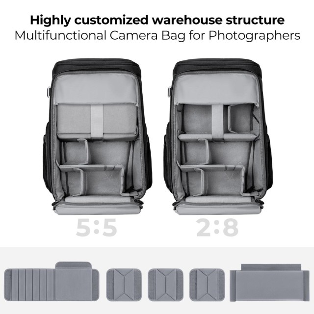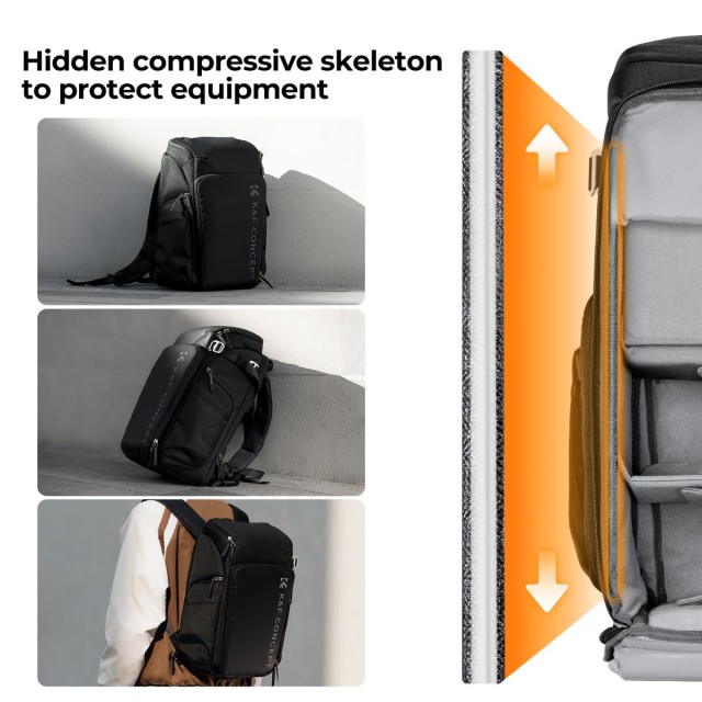 Fotografický batoh K&F Concept je vybaven univerzálním "Magic Bin Designem", díky kterému lze nastavit prostor a který je vhodný pro různé fotografické scénáře. Díky stabilní vnitřní podpoře, rozšíření kapacity, hornímu a bočnímu přístupu a zavěšené přihrádce na počítač zajišťuje bezpečnost a pohodlí fotografům, zejména těm, kteří se věnují outdoorové a portrétní fotografii.