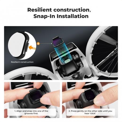Díky designu s rychlým uzávěrem se filtry během několika sekund bezpečně připevní k vaší kameře DJI Flip – bez použití nářadí. Jsou lehké, ale odolné a dokonale zapadají, aniž by ovlivňovaly letové vlastnosti nebo kvalitu obrazu.