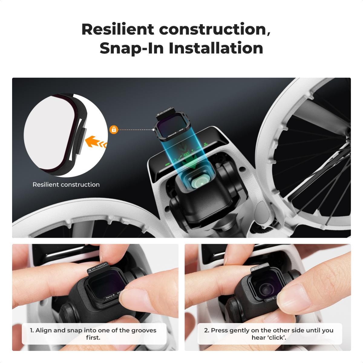 Filtry jsou vybaveny zacvakávacím systémem, který perfektně pasuje na kameru DJI Flip 4K UHD. Stačí je jednoduše nasadit – a můžete okamžitě začít s leteckým natáčením.