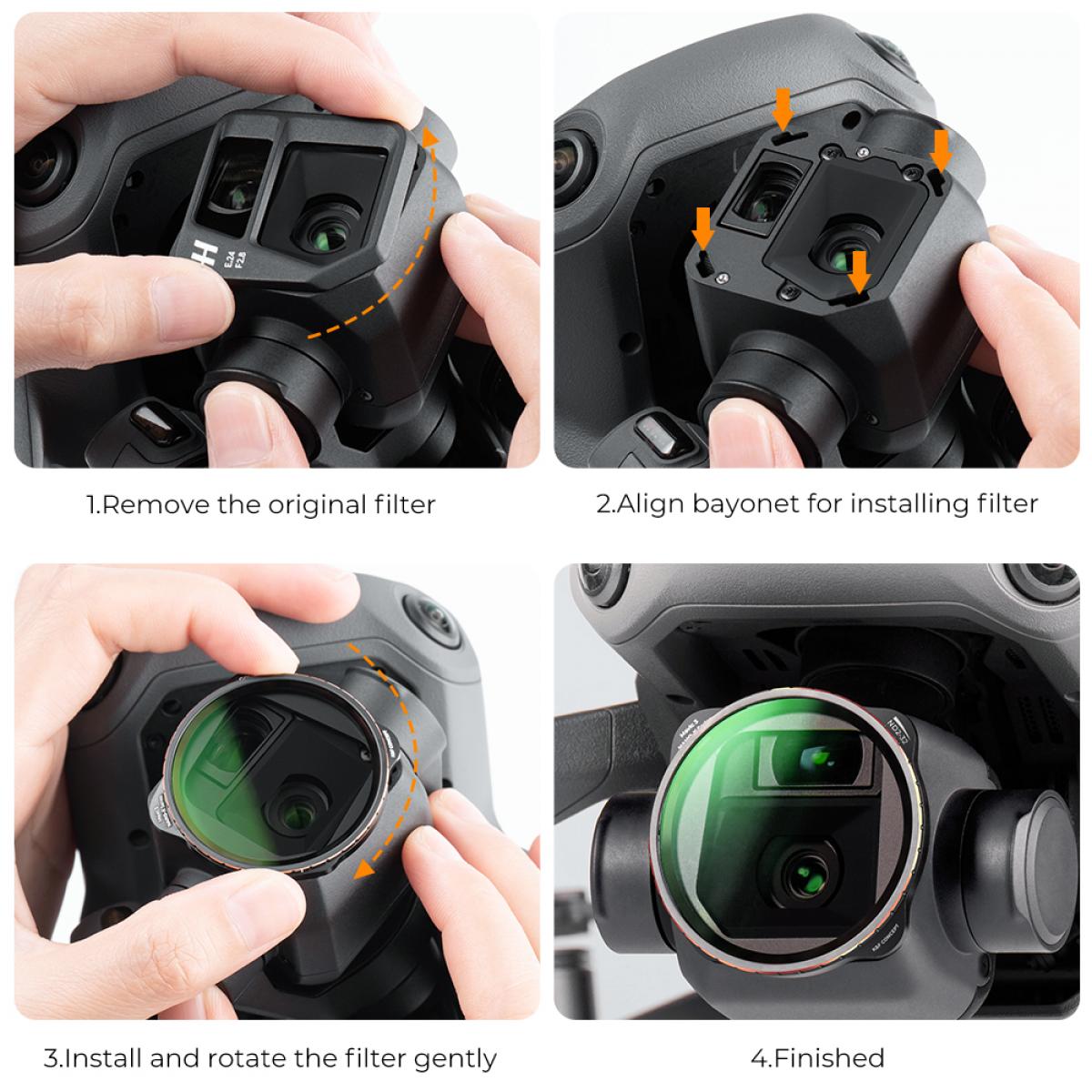 - 1* Variabilní filtr ND2-ND32 + 1* CPL filtr + 1* ND2-ND32 a černý difuzní 1/4 multifunkční filtr 2 v 1. Vhodné pro DJI Mavic 3/DJI Mavic 3 Cine.