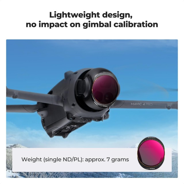 Tato sada filtrů ND CPL 2 v 1 je speciálně vyrobena pro DJI Mavic 4 Pro a obsahuje 4 kusy – ND8&PL+ND16&PL+ND32&PL+ND64&PL. Snadná instalace, stejný způsob instalace jako u originálního ochranného objektivu DJI. Vyrobeno z importovaného optického skla AGC s vícevrstvým povlakem, snižuje odlesky a reflexe objektivu a zajišťuje obnovení skutečných barev obrazu.