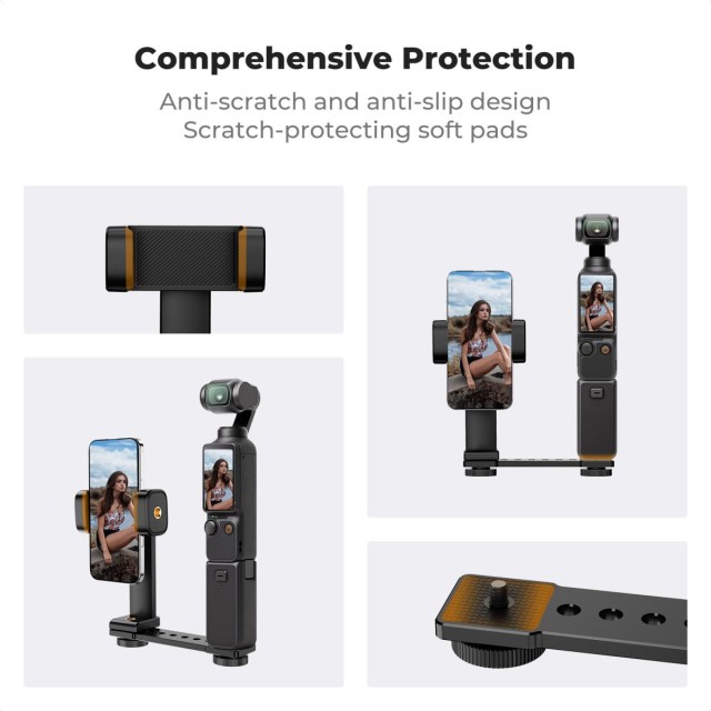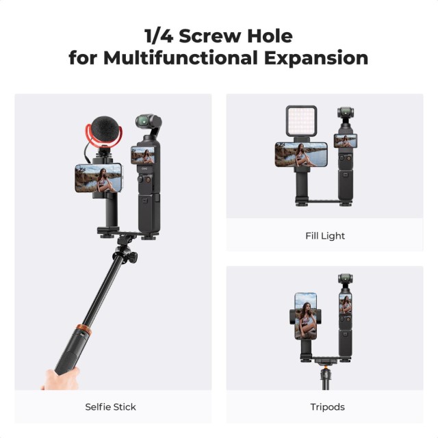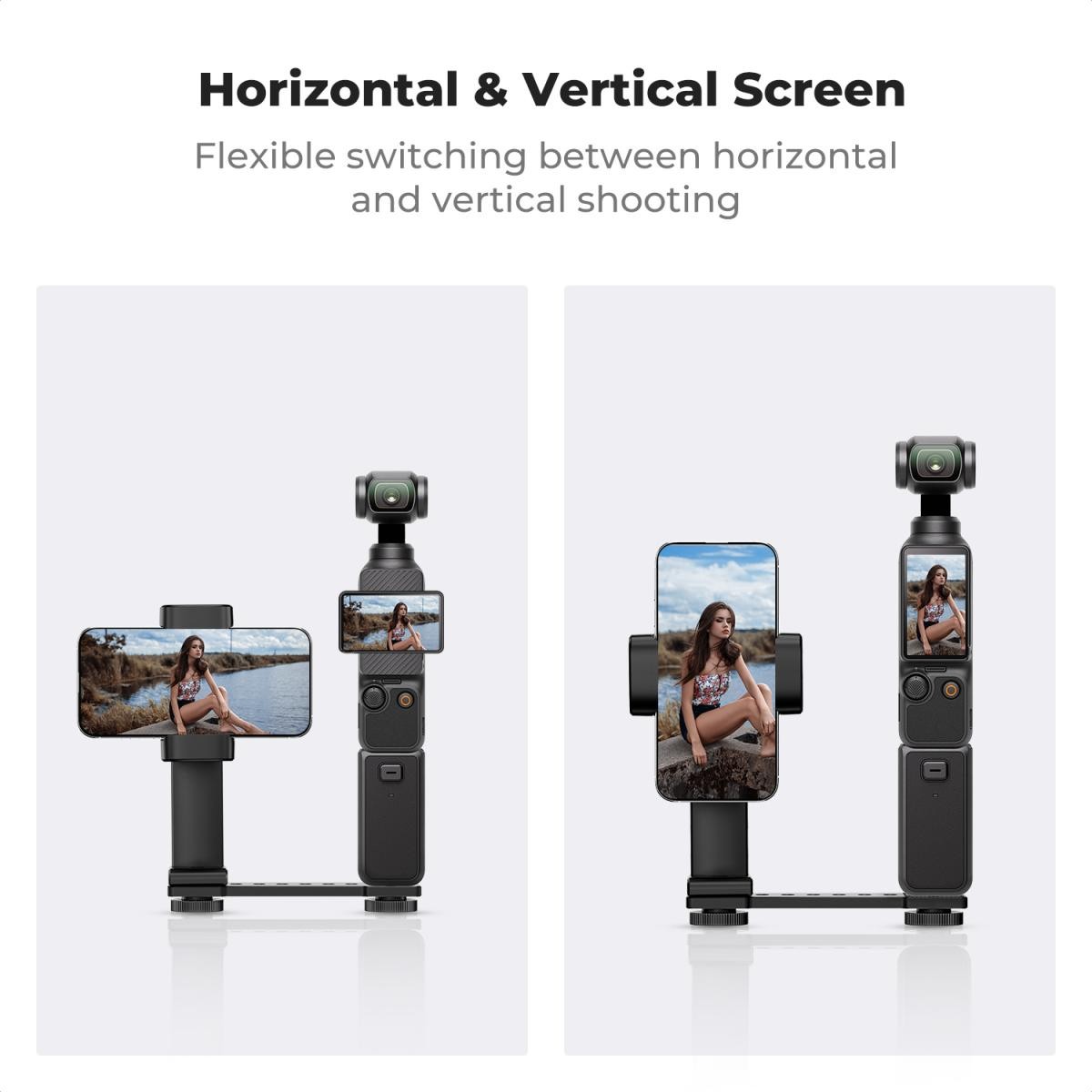 Stojan na mobilní telefon K&F Concept DJI Osmo Pocket 3 je dokonalým doplňkem pro váš Pocket 3, který hladce integruje váš smartphone pro zvětšený obraz a vylepšené ovládání kamery. Je vyroben z prvotřídní hliníkové slitiny a odolného plastu PC+ABS s nerezovou ocelí, což zajišťuje stabilní a bezpečné připojení. Díky univerzálnímu horizontálnímu a vertikálnímu otáčení o 360°, nastavení sklonu o 180° a několika možnostem upevnění, včetně studené patky a 1/4" portů, je ideální pro stativy, světla, mikrofony a další zařízení.