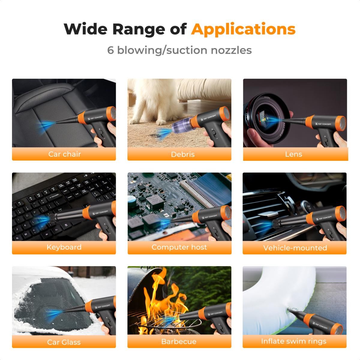 Sada na foukání vzduchu je navržena pro všestranné použití a obsahuje několik trysek a kartáčů spolu s vysávacími utěrkami, takže je vhodná pro čištění notebooků, interiérů automobilů, sedadel a povrchů v domácnosti. Kromě použití v interiéru se hodí také pro venkovní aktivity, jako je sfoukávání táboráků, nafukování plaveckých kruhů, sušení vlasů nebo srsti domácích mazlíčků a odstraňování sněhu nebo listí z vozidel.