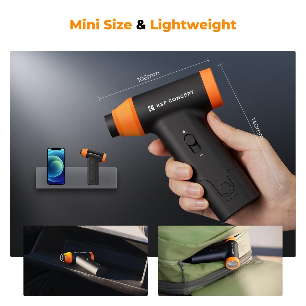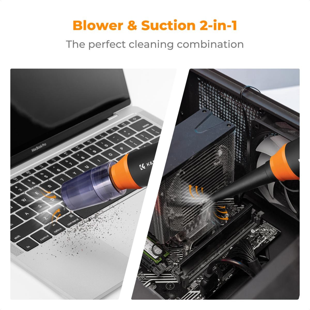 Elektrická čisticí souprava K&F CONCEPT je kompaktní, ale výkonný dobíjecí vzduchový čistič s vysokorychlostním bezkartáčovým motorem, nastavitelným průtokem vzduchu a několika tryskami pro všestranné čištění. Je navržen jako ekologická alternativa k jednorázovým plechovkám se stlačeným vzduchem a poskytuje silný a přesný proud vzduchu pro hloubkové čištění elektroniky, vozidel a dalších zařízení.