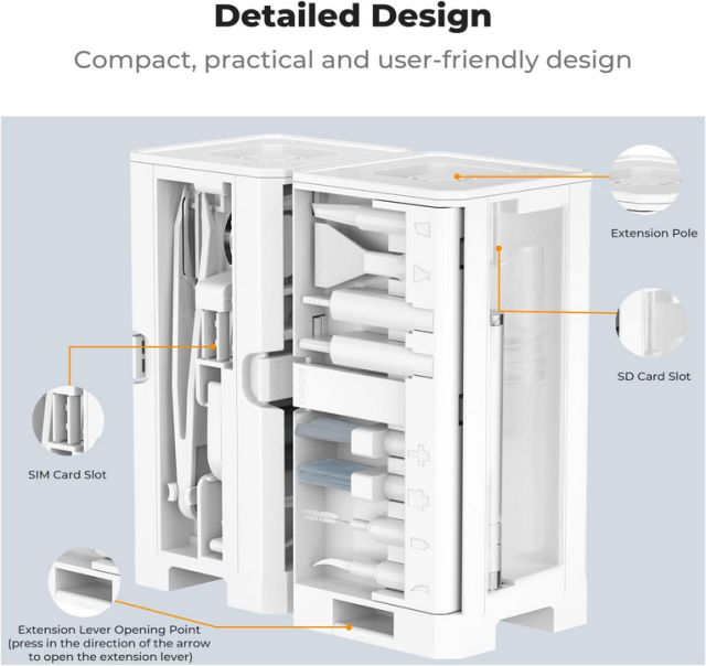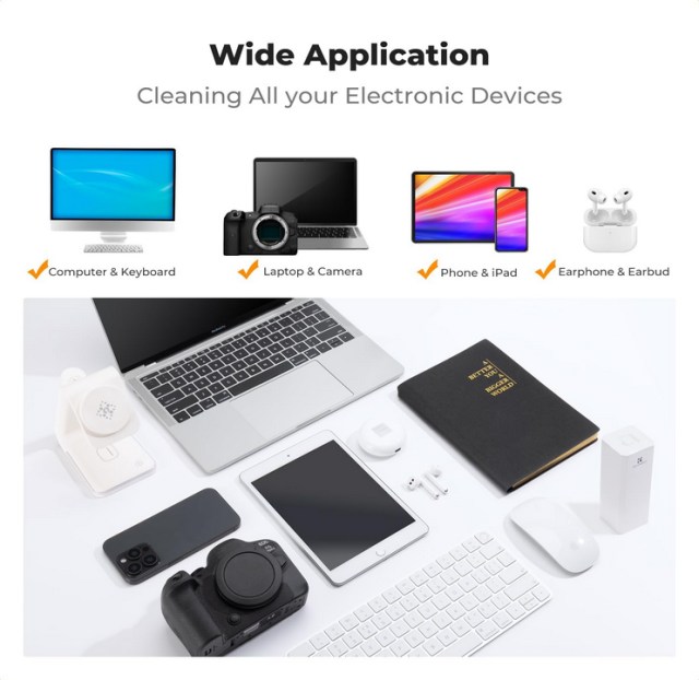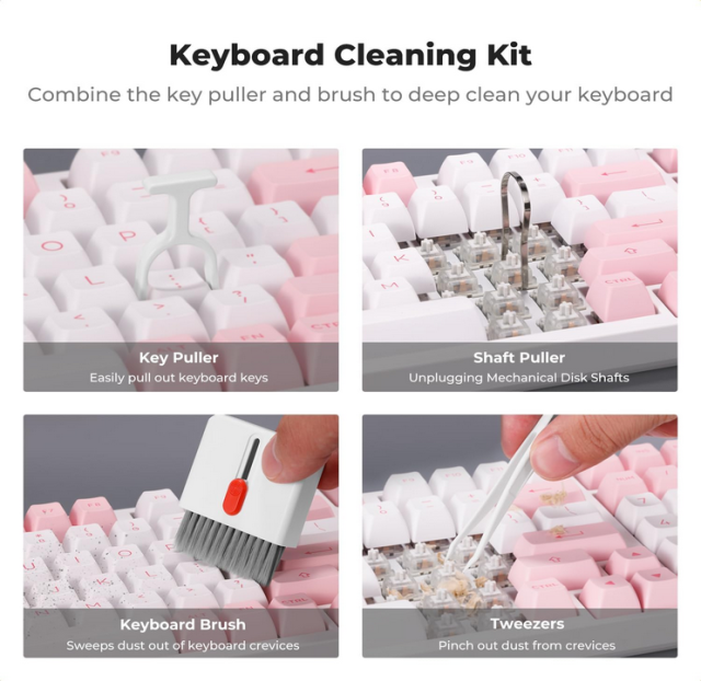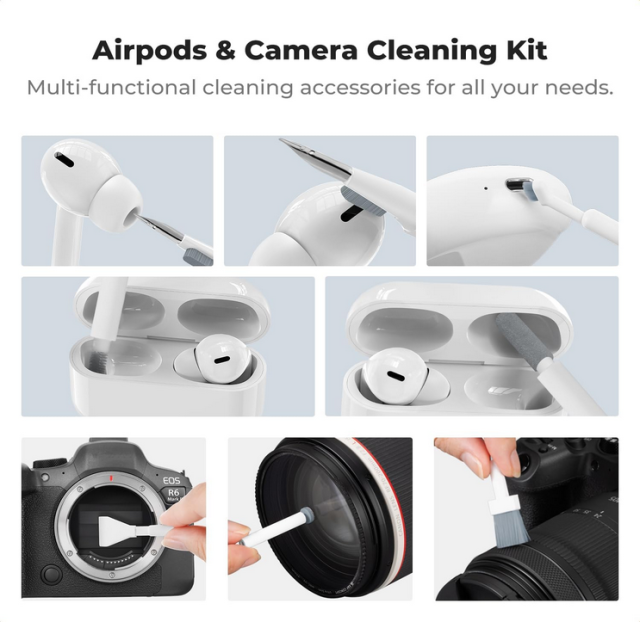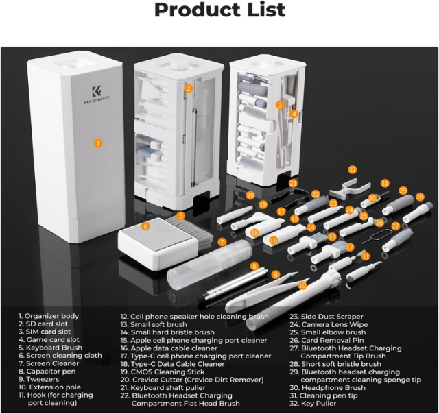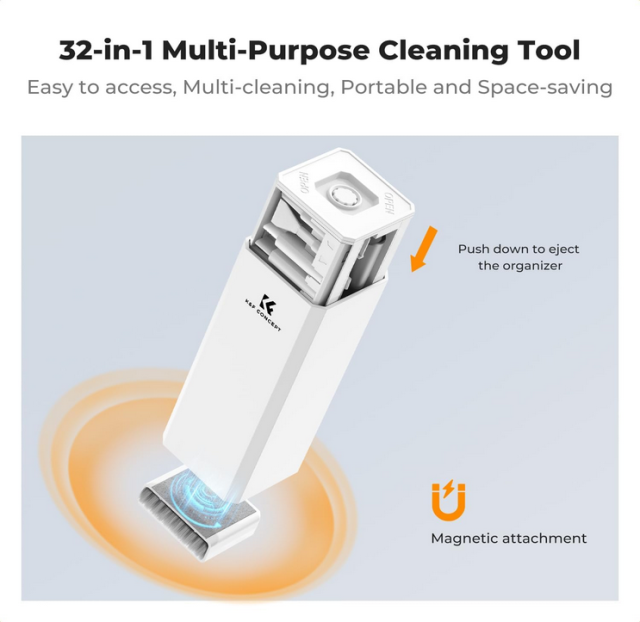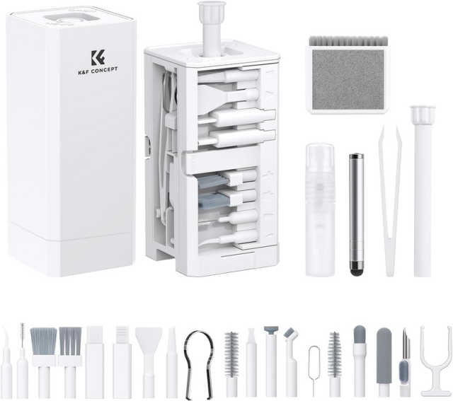 Vyčistěte každý kout a zákoutí svých technických zařízení pomocí sady K&F Concept 32-in-1 Keyboard Cleaner Kit, univerzálního řešení vše v jednom, které je navrženo pro snadnou údržbu klávesnic, smartphonů, sluchátek, notebooků a dalších zařízení. Tato kompaktní sada obsahuje jako hlavní prvek vysouvací velký kartáč, doplněný o speciální nástroje, jako jsou šikmé hroty pro nabíjecí porty a reproduktory, silikonové čističe pro porty Lightning a USB-C, vyhazovač SIM karet a stylus pro přesnou interakci s obrazovkou. Odstraňte odolné nečistoty ze sluchátek pomocí oboustranného čisticího pera (kovová špička pro odolné skvrny, mini kartáček pro síťky), kulaté houbičky pro vnitřní části nabíjecích pouzder a měkkých kartáčků pro odstranění prachu – to vše vylepšené výsuvnou rukojetí pro těžko přístupná místa. U klávesnic vysokohustotní kartáč odstraní prach z povrchu, zatímco nástroje na sejmutí kláves a spínačů umožňují snadnou demontáž mechanických sestav; pro důkladné hloubkové čištění přidejte kartáč s tvrdými štětinami a pinzetu. 5ml sprejová lahvička (prázdná, připravená pro váš roztok) se kombinuje s vláknovými utěrkami k odstranění otisků prstů a mastnoty z obrazovek telefonů, tabletů nebo monitorů. Ergonomické tělo slouží zároveň jako bezpečné úložiště pro SD/SIM karty, takže vše zůstává přehledné a přenosné. Tato sada, určená pro každodenní použití na malé elektronické přístroje, zajišťuje bezšmouhové a bezpoškozené výsledky díky odolným integrovaným nástrojům, které si poradí s jakýmkoli úklidovým úkolem.